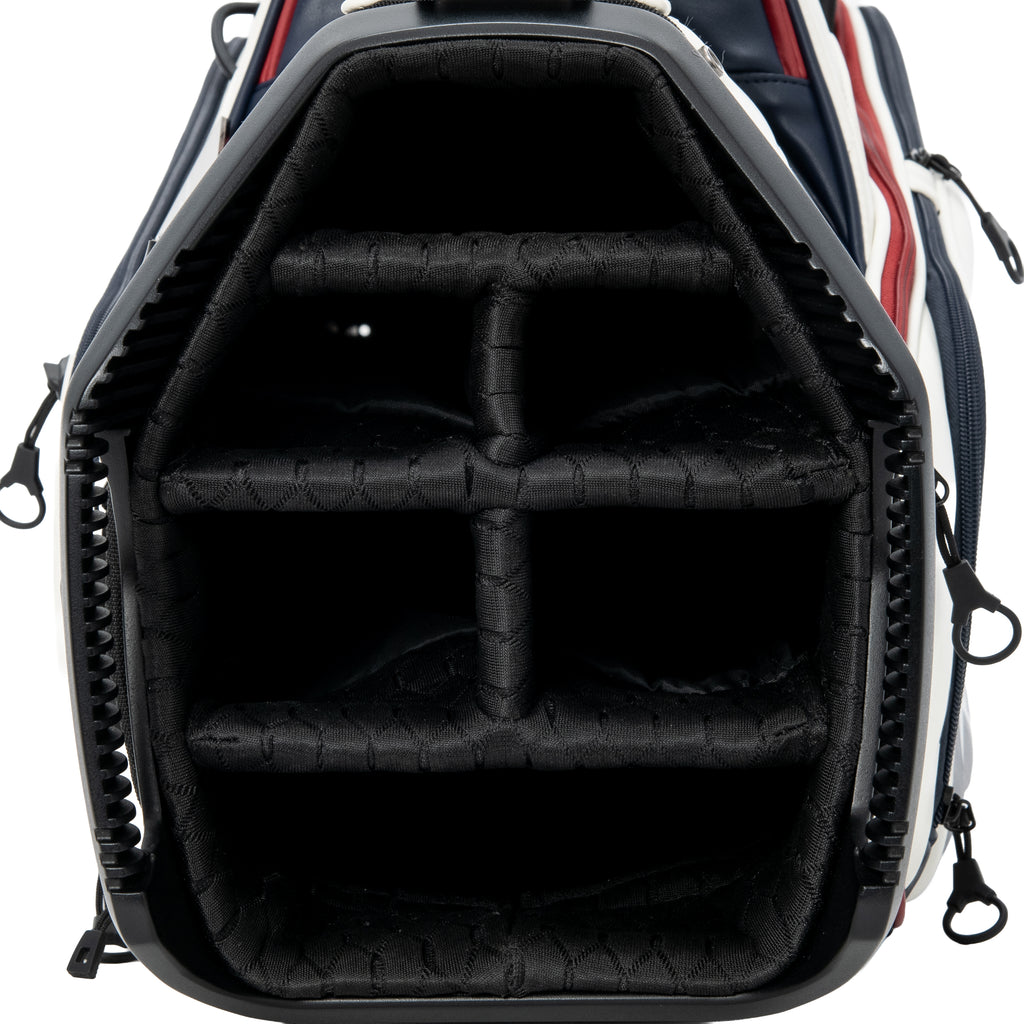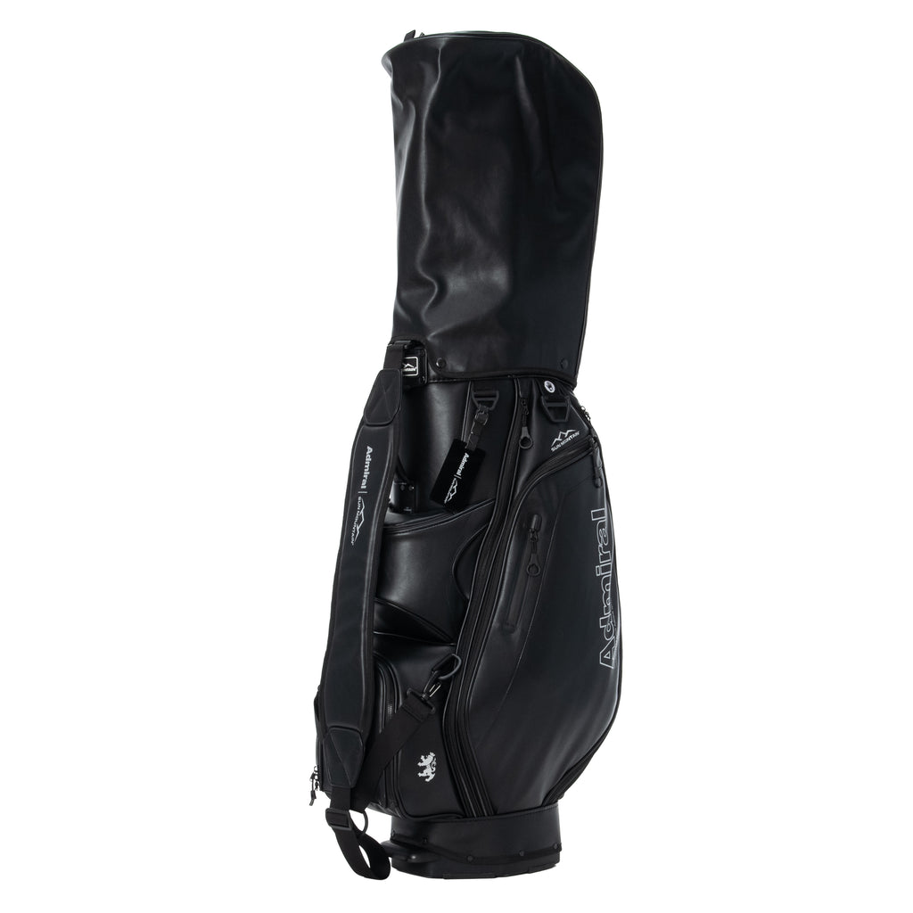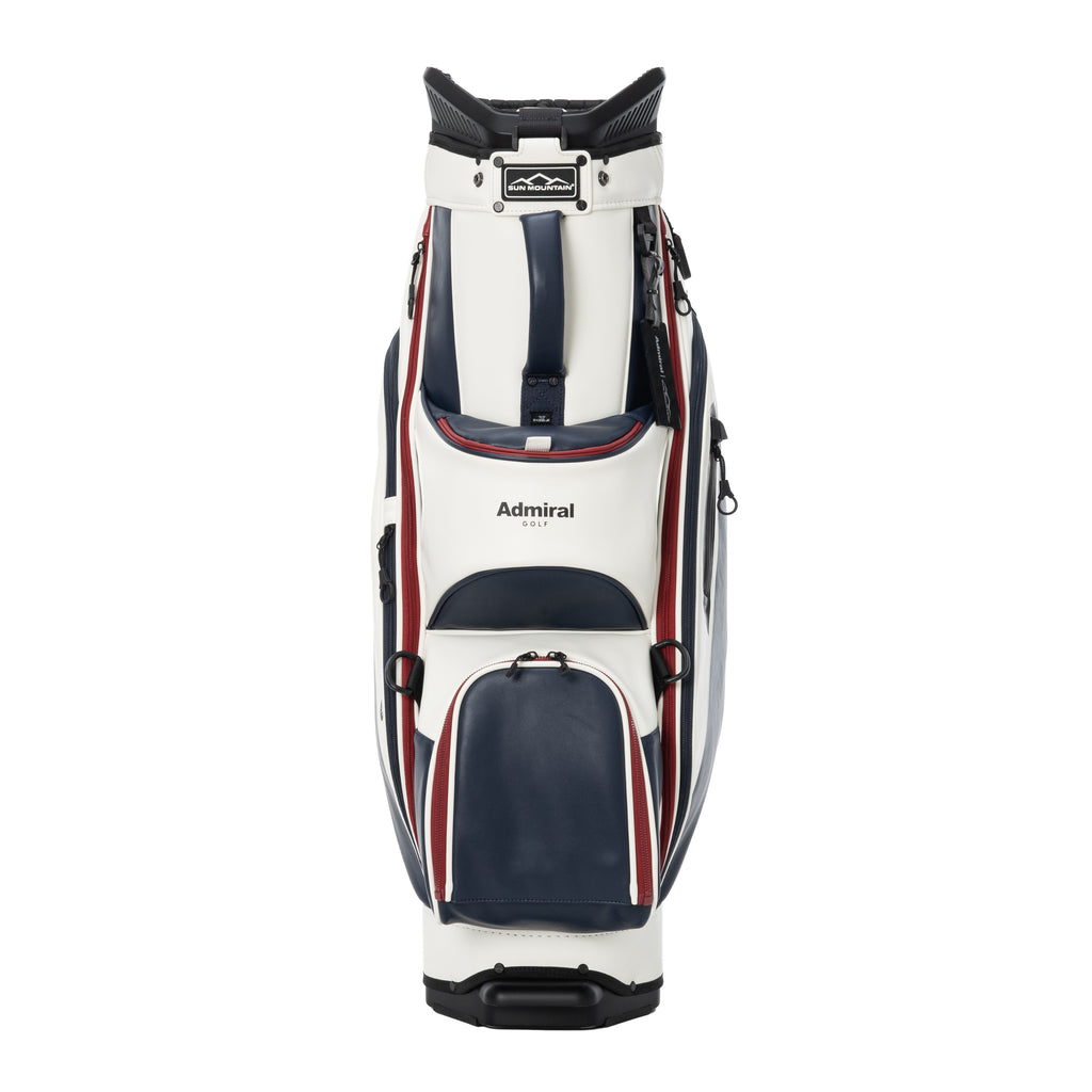 This golf bag is a collaboration between Admiral and Sun Mountain. The logo is printed on the front. Made from soft, luxurious synthetic leather, it features a handle for easy portability. The lower front pocket is removable and can be personalized with your name. It also features numerous pockets, including an insulated pocket and a pocket for valuables, for excellent storage capacity. The 9.5-inch opening has six compartments and six separators.