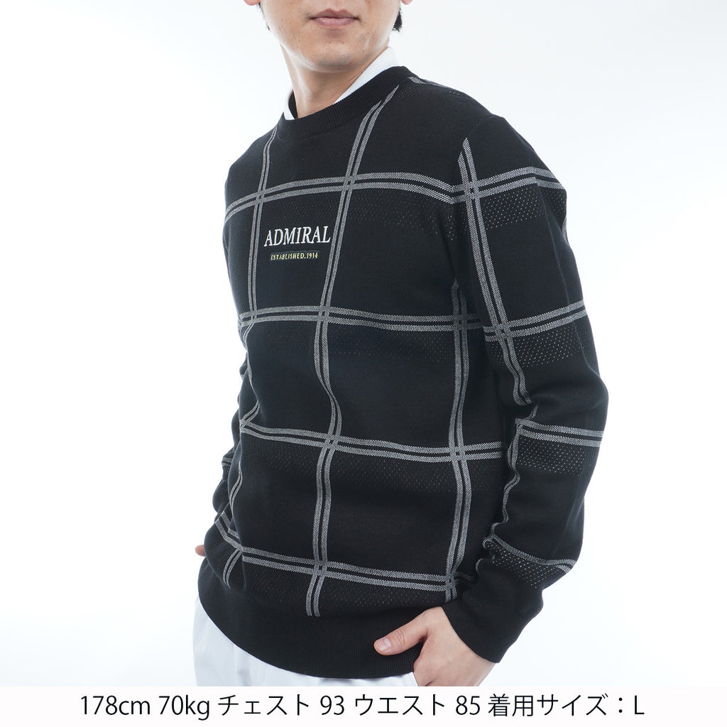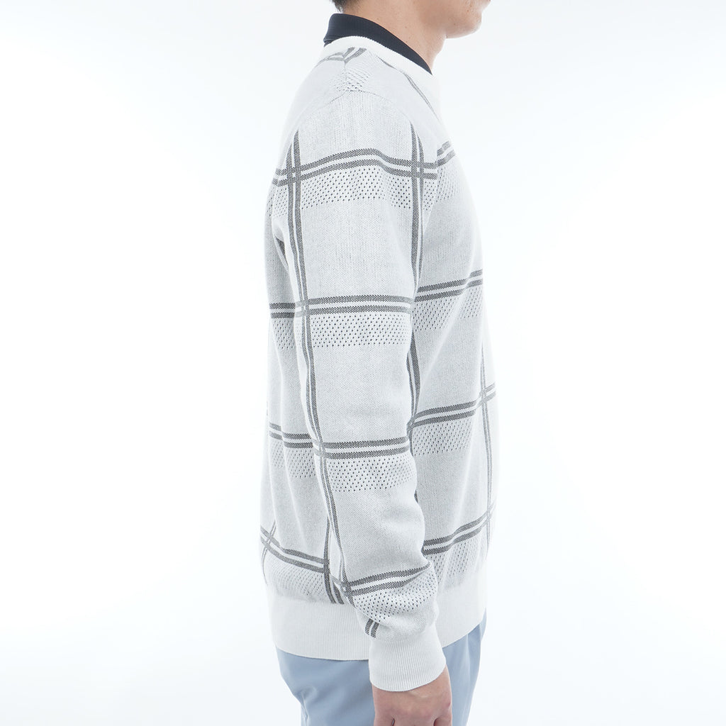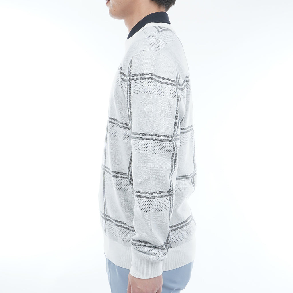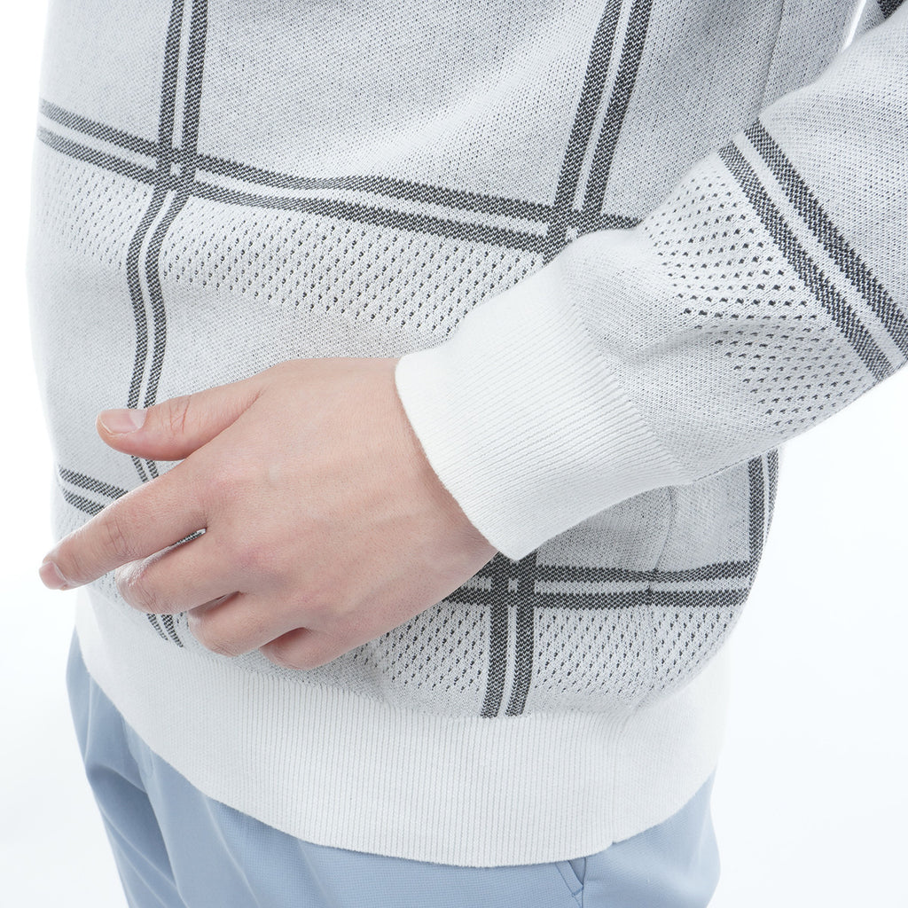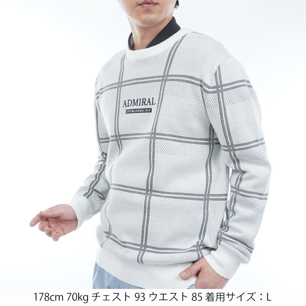 ポリエステル糸を使用したクルーネックセーター。 コットン糸を編み合わせることで硬さも軽減されています。 柄はウィンドペンの柄にアイレットの編み地をボーダー状に配置し、通気性にも考慮をしました。
