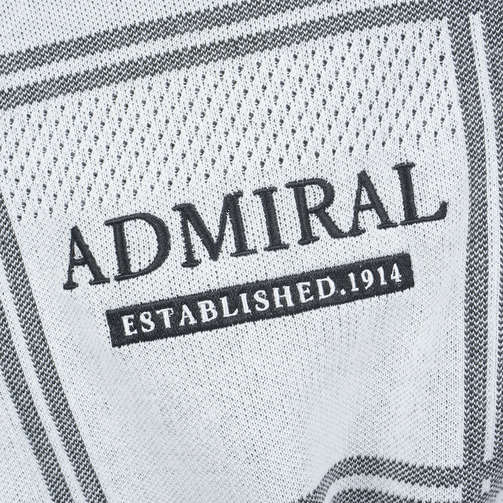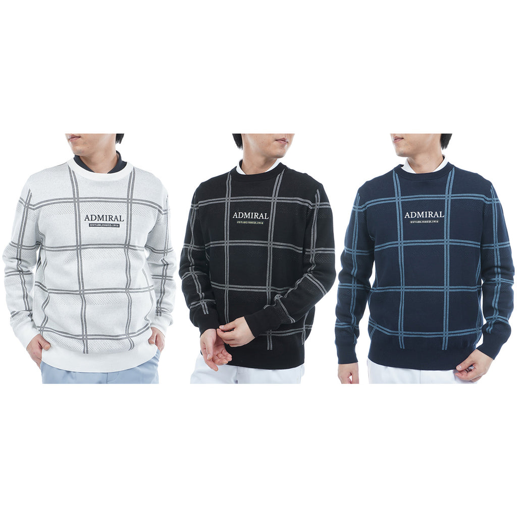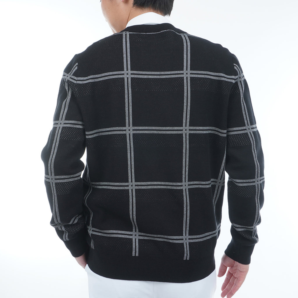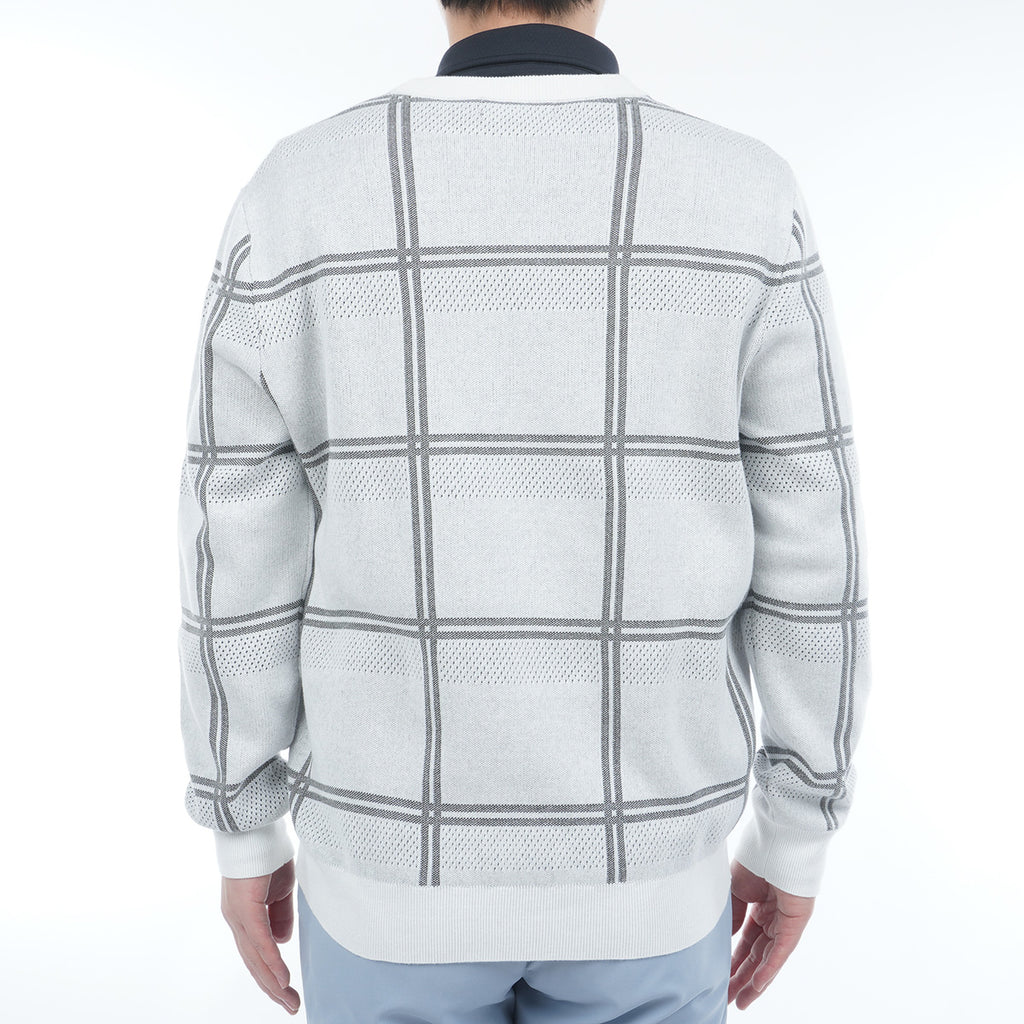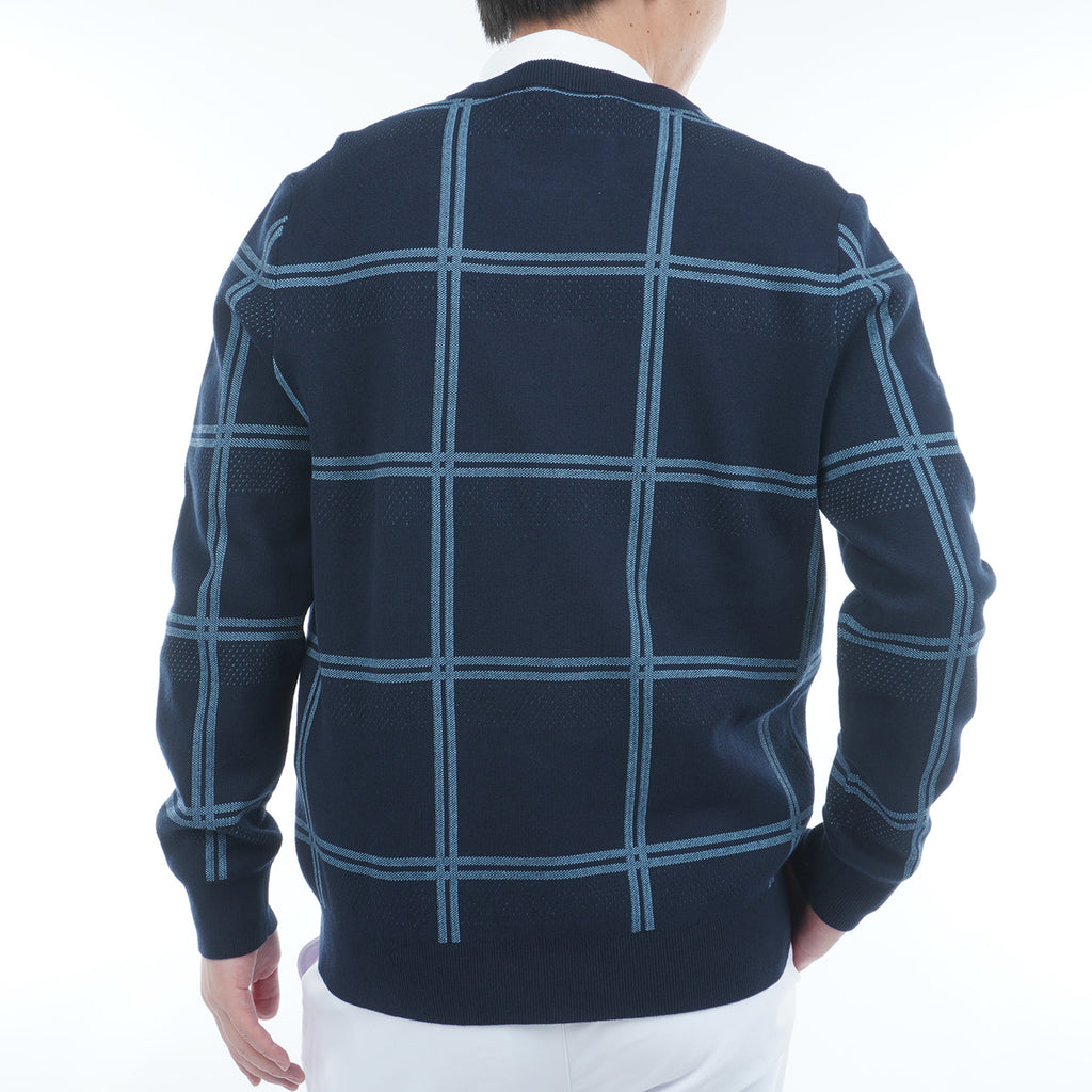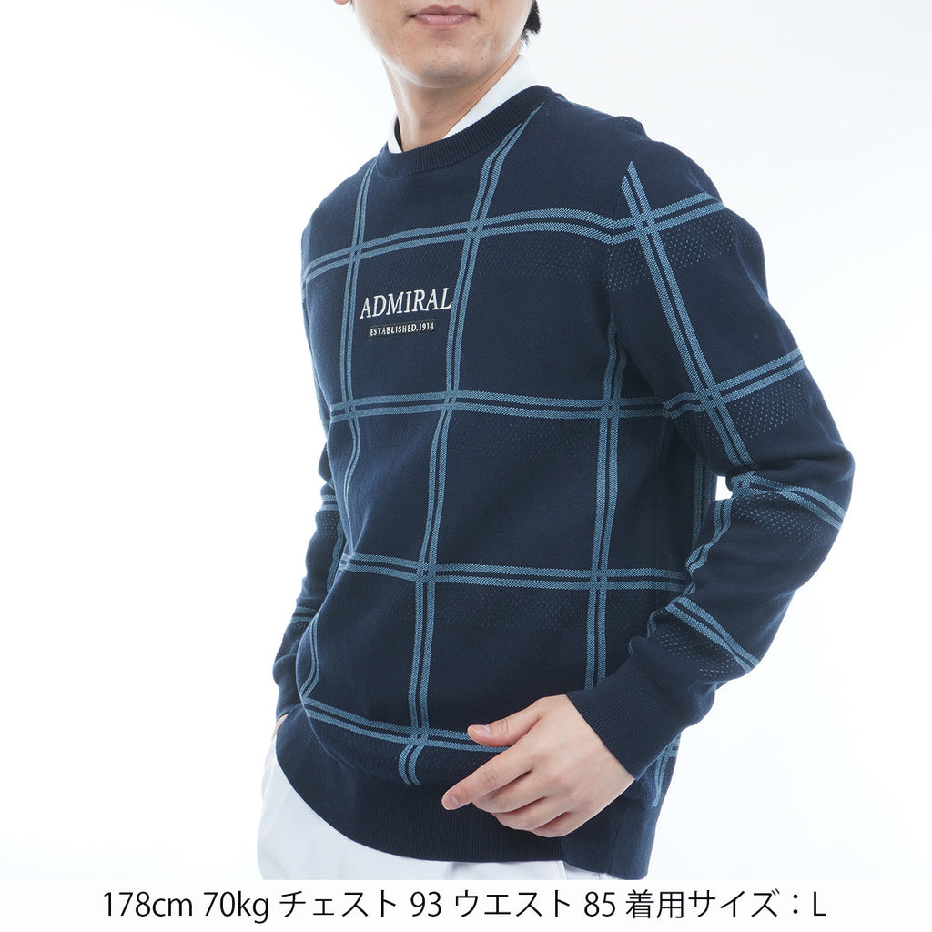 ポリエステル糸を使用したクルーネックセーター。 コットン糸を編み合わせることで硬さも軽減されています。 柄はウィンドペンの柄にアイレットの編み地をボーダー状に配置し、通気性にも考慮をしました。