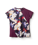 ストレッチ天竺素材を使用。大胆な柄使いの中に斜めのアシンメトリーの無地切替を施し