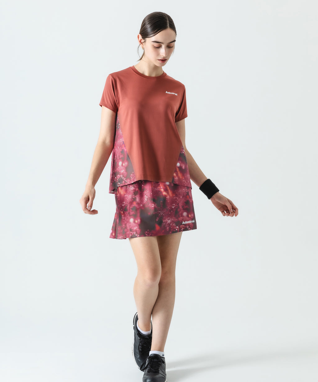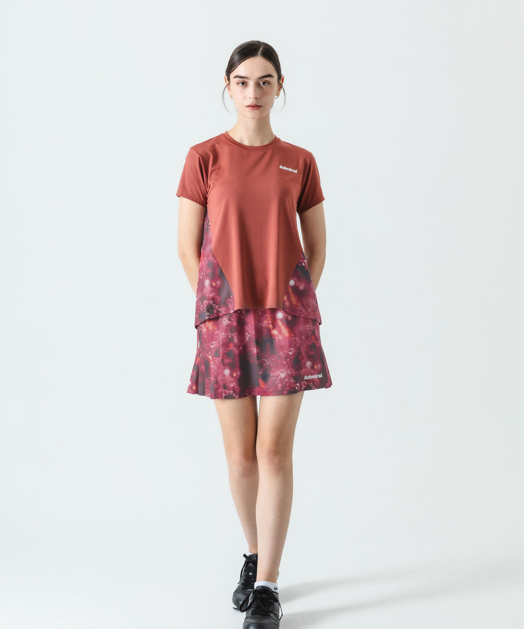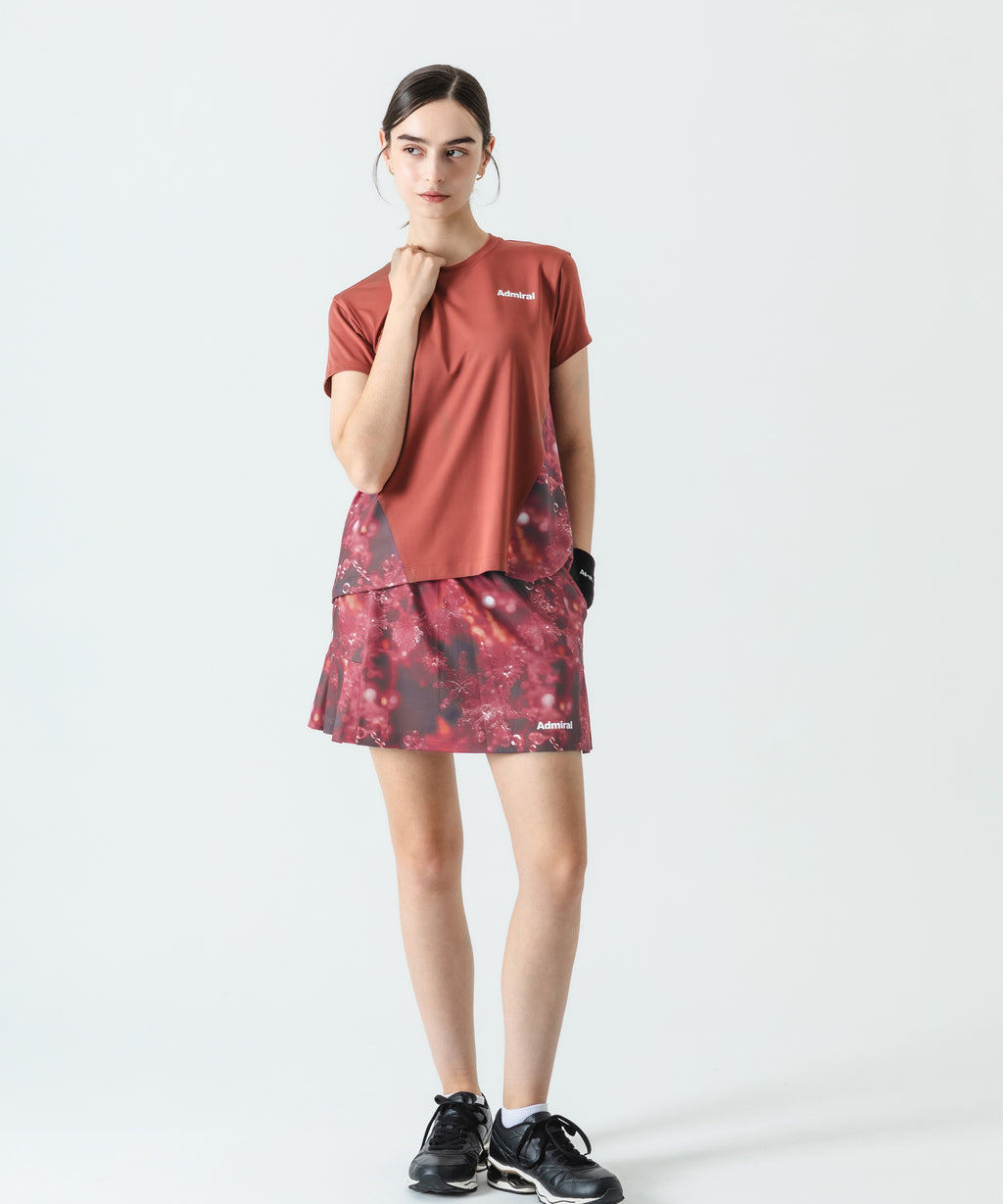 人気のスコートが総グラフィックバージョンとして登場。フレアシルエットに 控えめにプリーツを施した、フレアとプリーツのいい所どりデザイン。 定番の機能性ストレッチ天竺素材を使用。両脇ポケット、ウエスト紐調整有り。