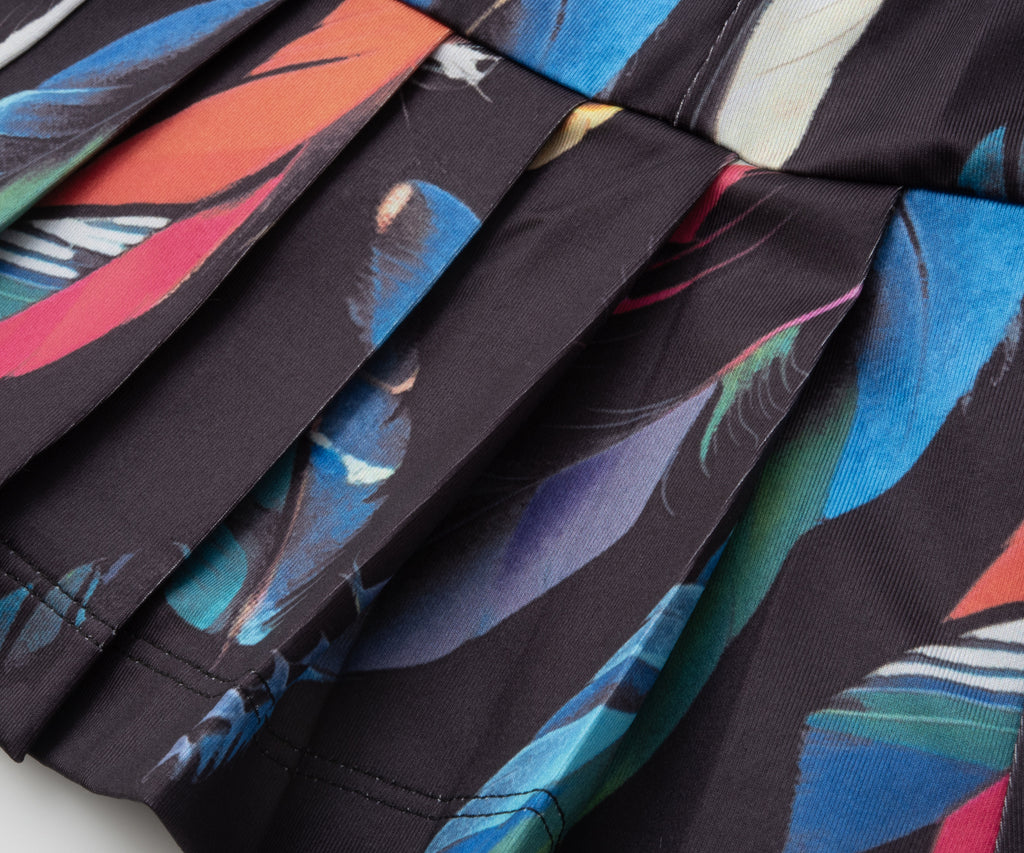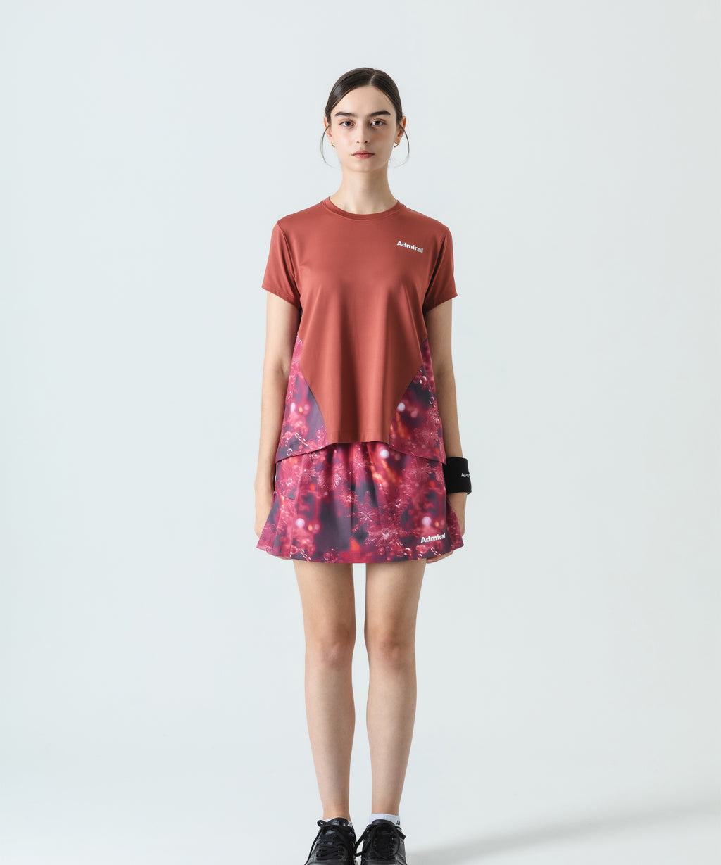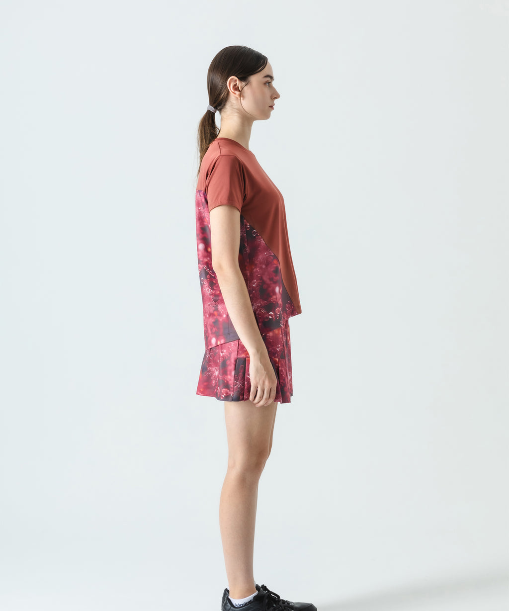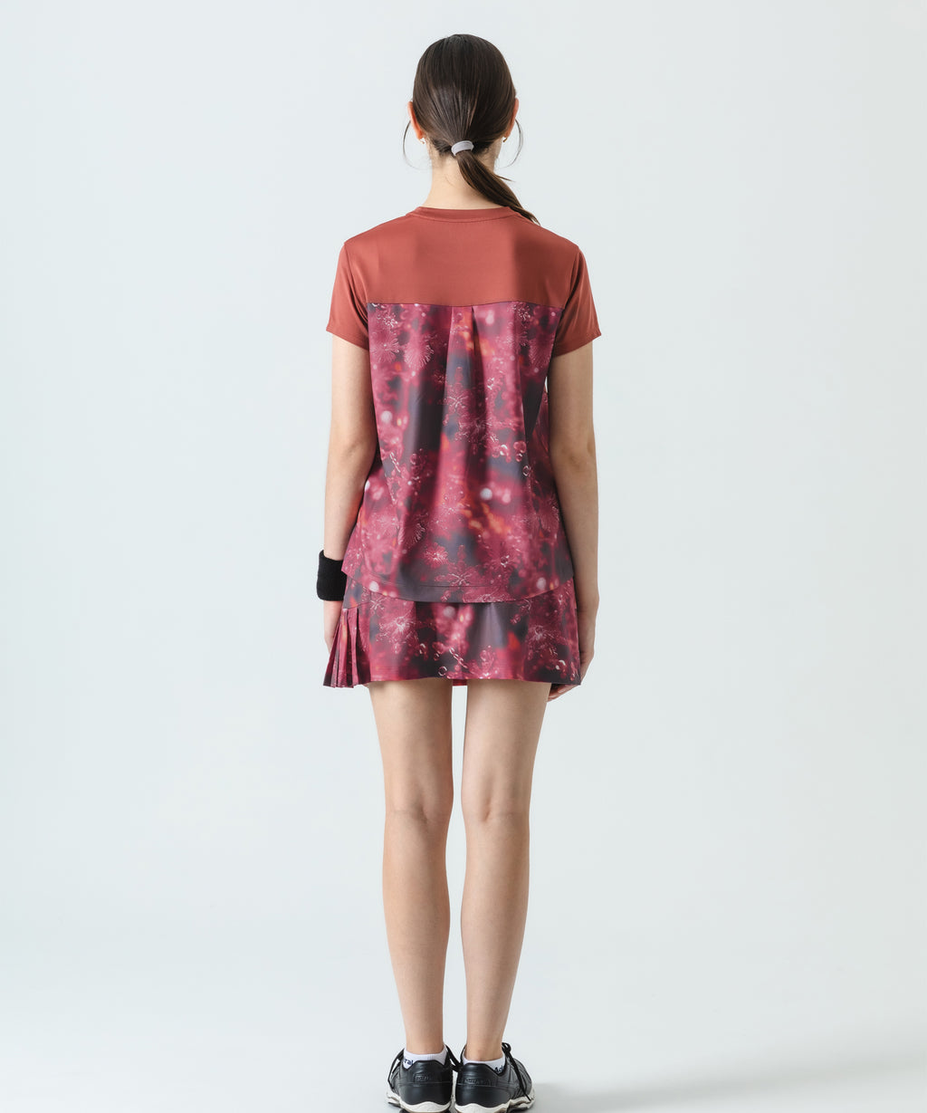 人気のスコートが総グラフィックバージョンとして登場。フレアシルエットに 控えめにプリーツを施した、フレアとプリーツのいい所どりデザイン。 定番の機能性ストレッチ天竺素材を使用。両脇ポケット、ウエスト紐調整有り。