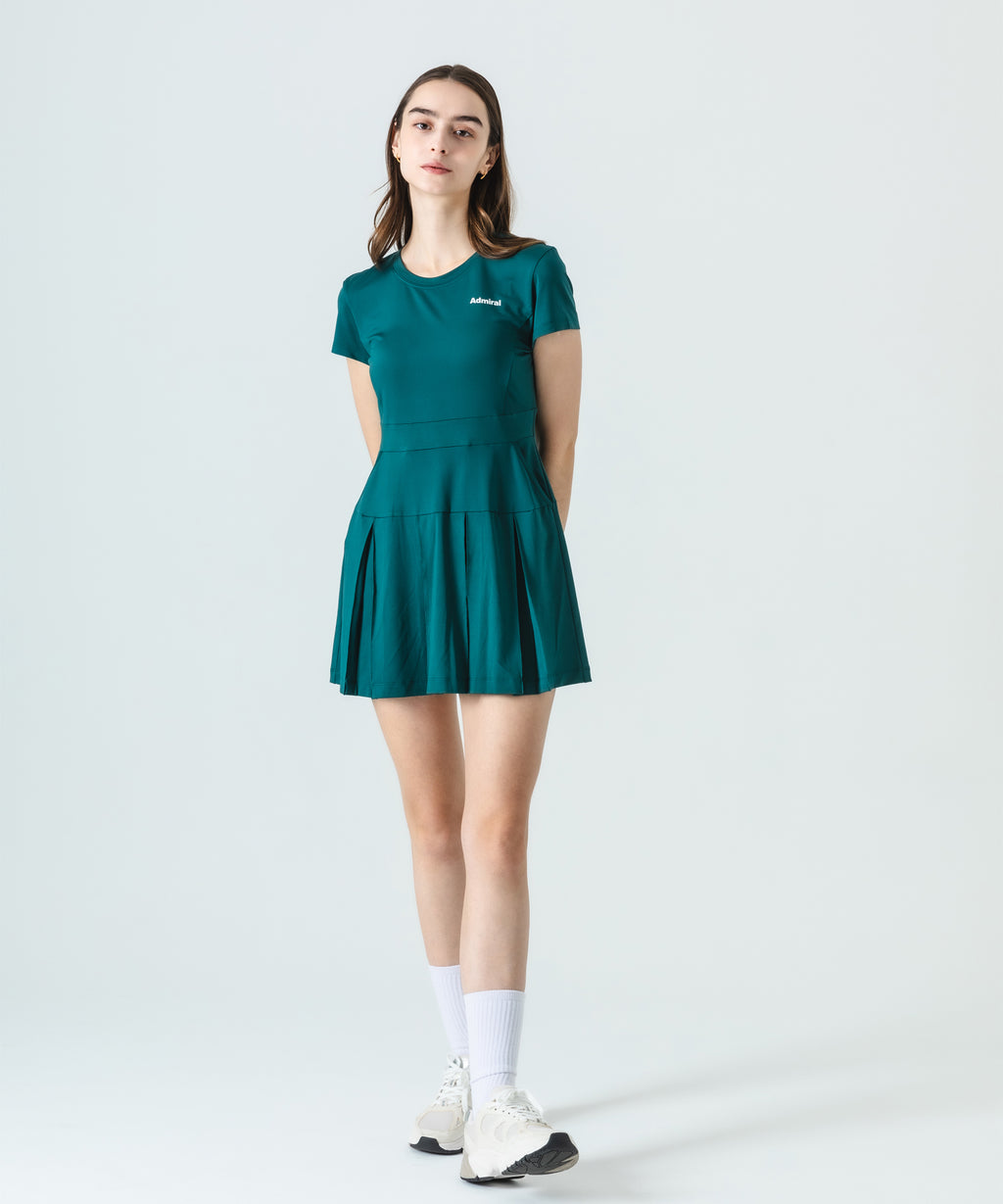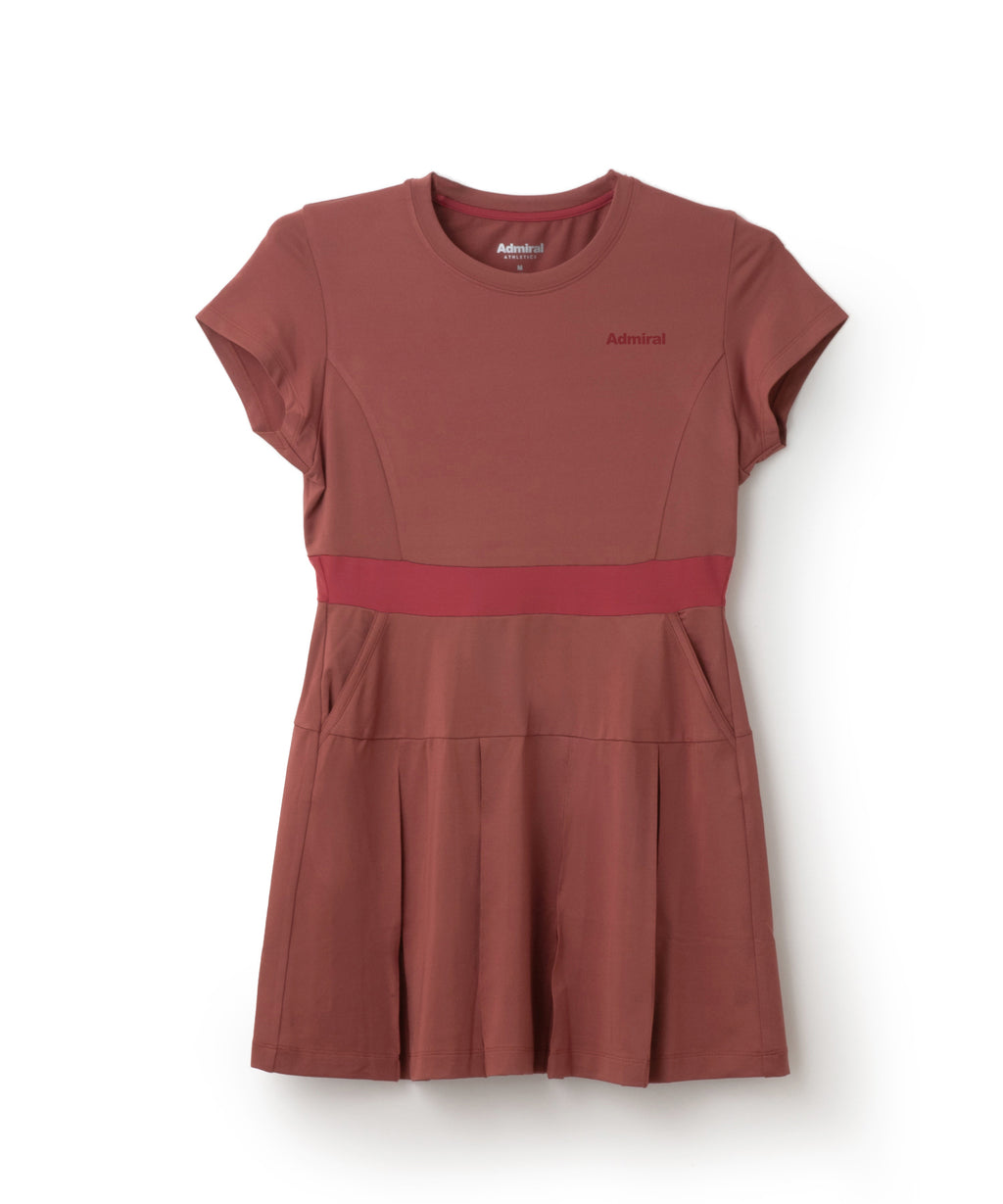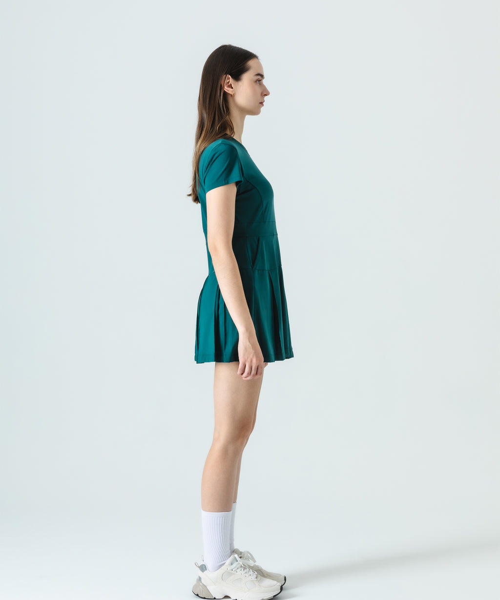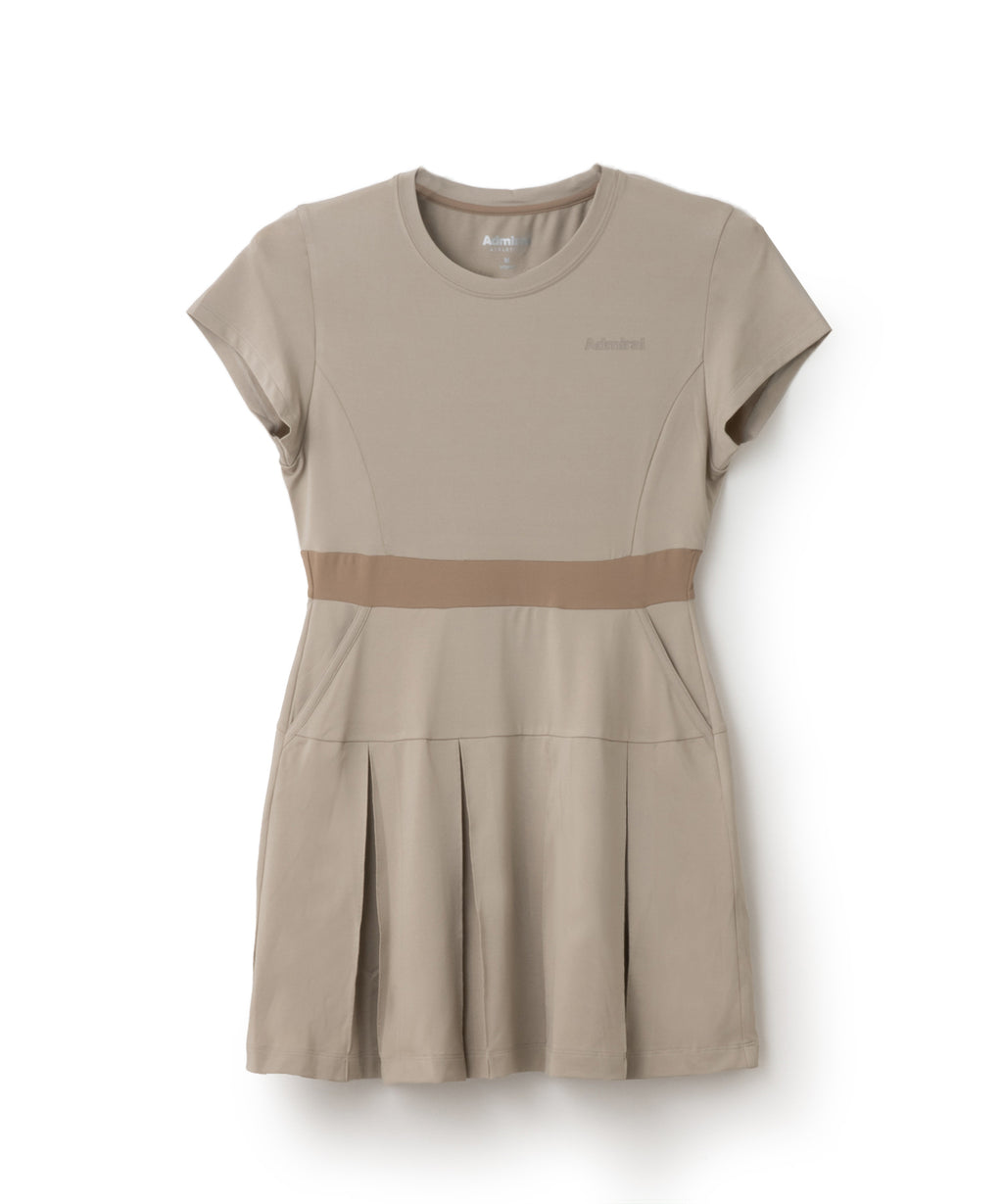 単色使いのシンプルな上品さをデザインした半袖タイプのワンピース。 身頃はパネル切替えで細見えを演出し、裾タックプリーツ仕様で無地でも存在感のあるアイテム。吸水速乾・ストレッチと UVカットの機能を持ちながら、抜群の伸縮性でしなやかな着心地を実現するストレッチ天竺素材を使用。両脇ポケット有り。