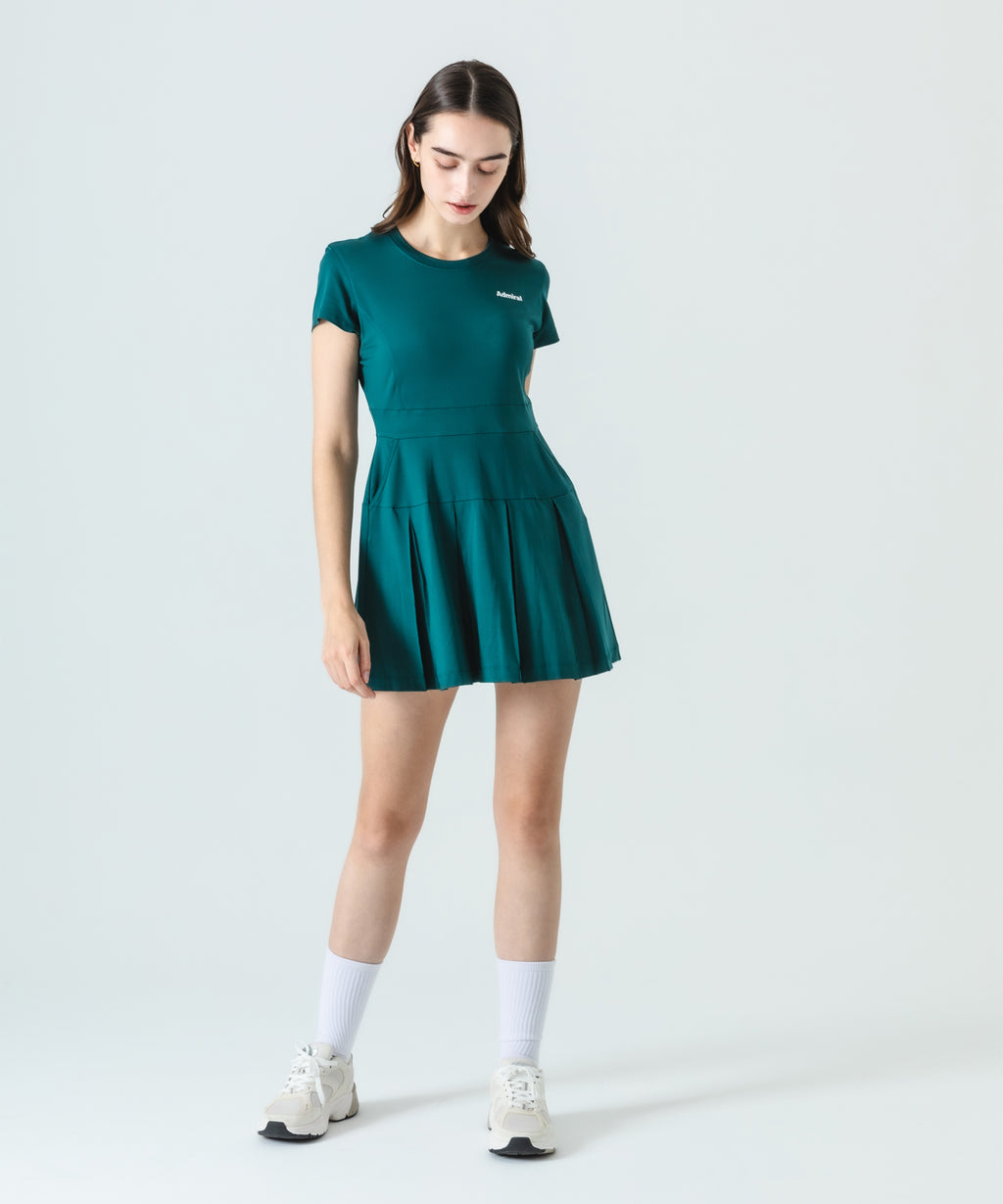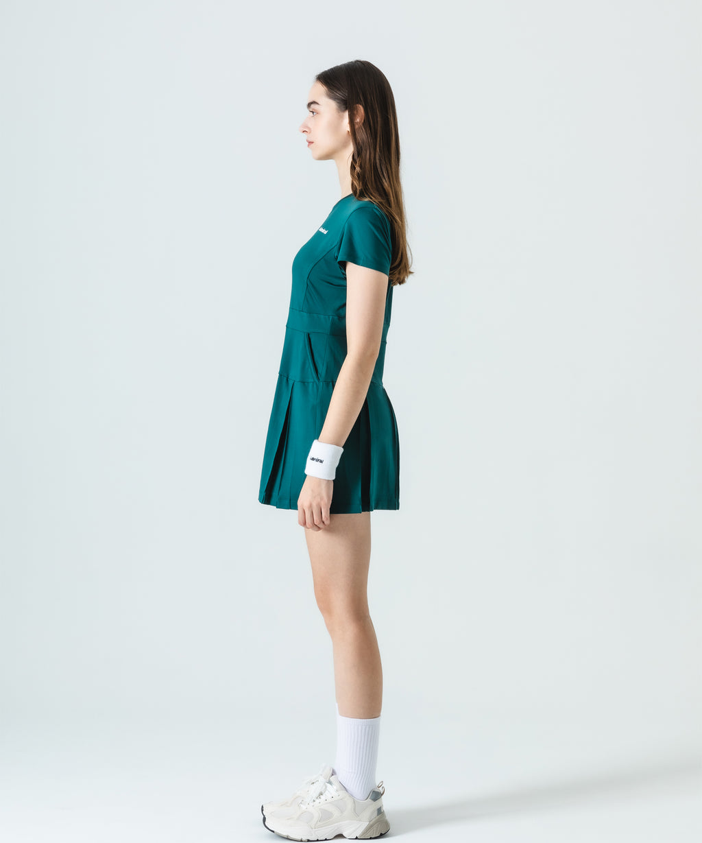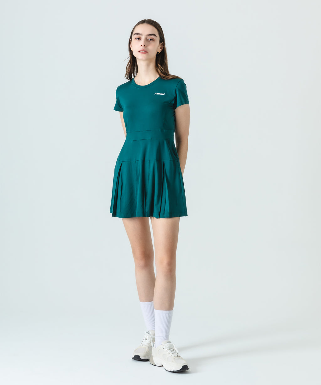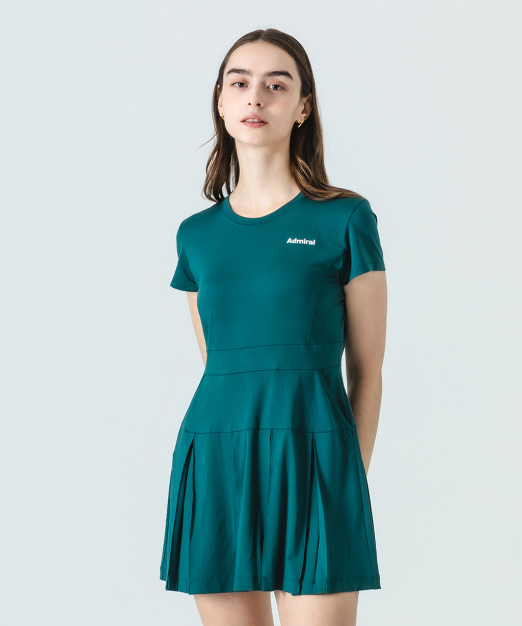 単色使いのシンプルな上品さをデザインした半袖タイプのワンピース。 身頃はパネル切替えで細見えを演出し、裾タックプリーツ仕様で無地でも存在感のあるアイテム。吸水速乾・ストレッチと UVカットの機能を持ちながら、抜群の伸縮性でしなやかな着心地を実現するストレッチ天竺素材を使用。両脇ポケット有り。