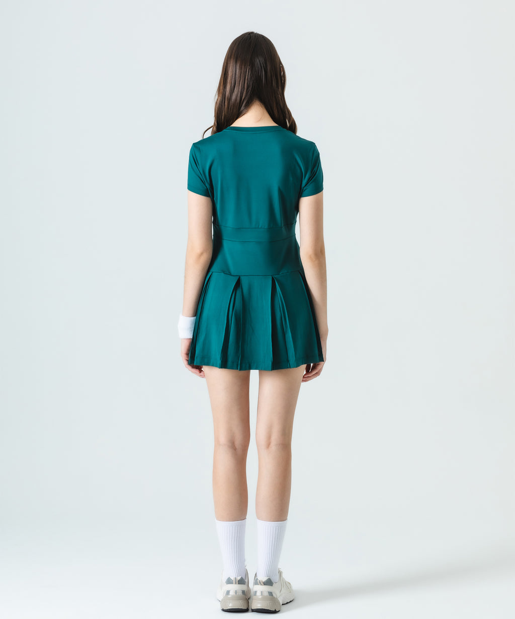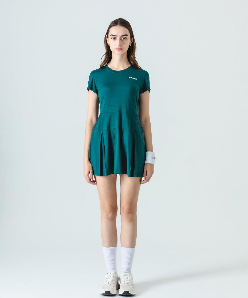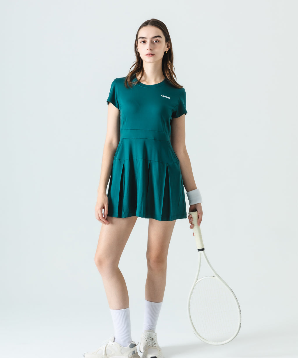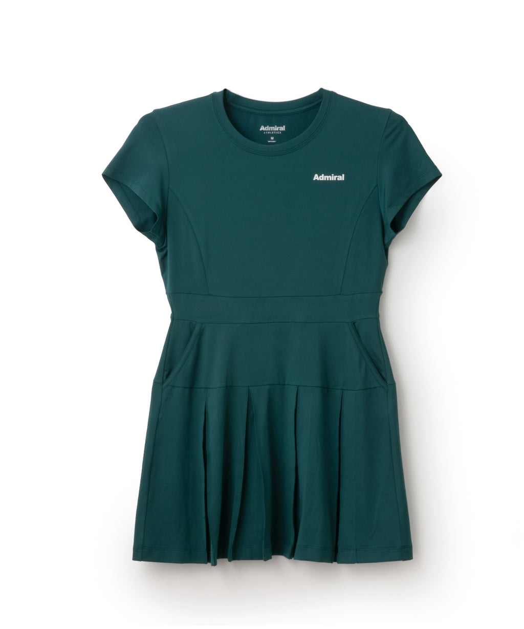 単色使いのシンプルな上品さをデザインした半袖タイプのワンピース。 身頃はパネル切替えで細見えを演出し、裾タックプリーツ仕様で無地でも存在感のあるアイテム。吸水速乾・ストレッチと UVカットの機能を持ちながら、抜群の伸縮性でしなやかな着心地を実現するストレッチ天竺素材を使用。両脇ポケット有り。