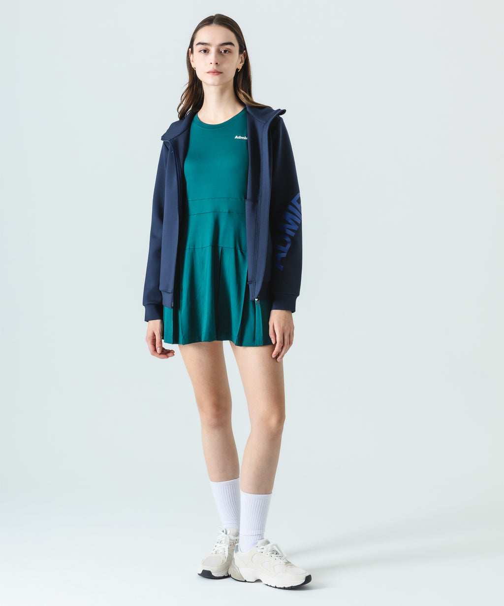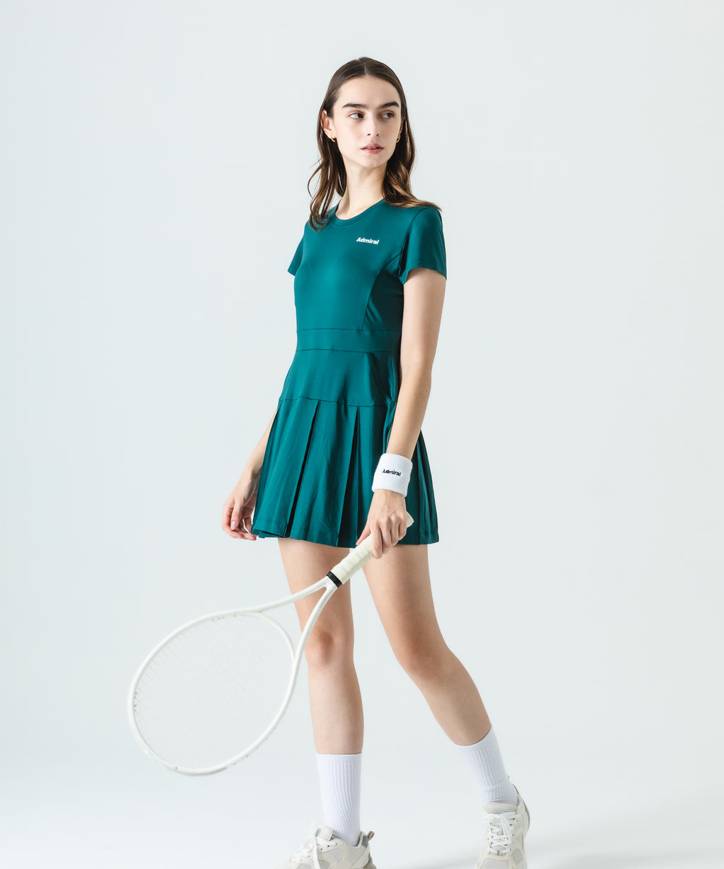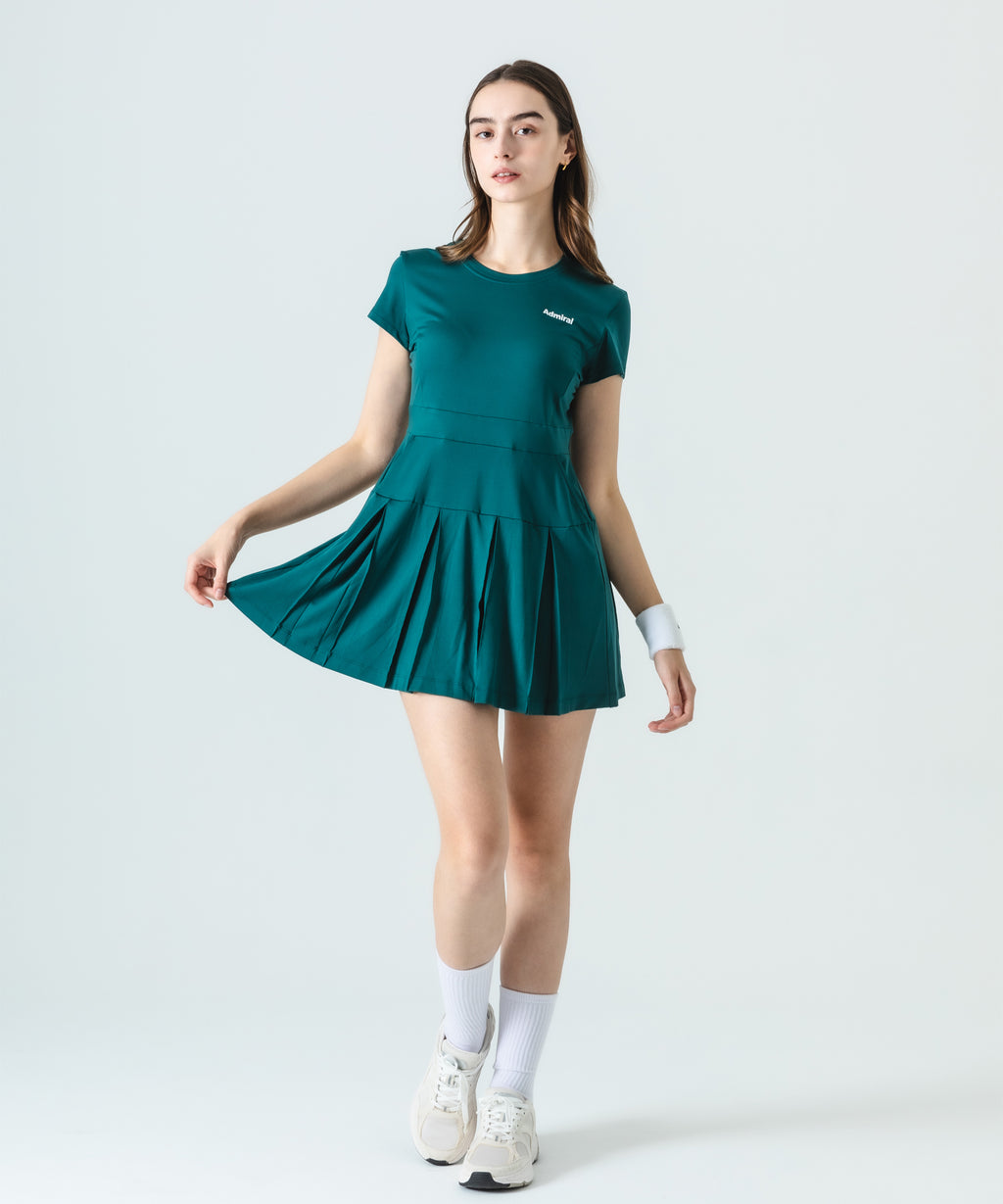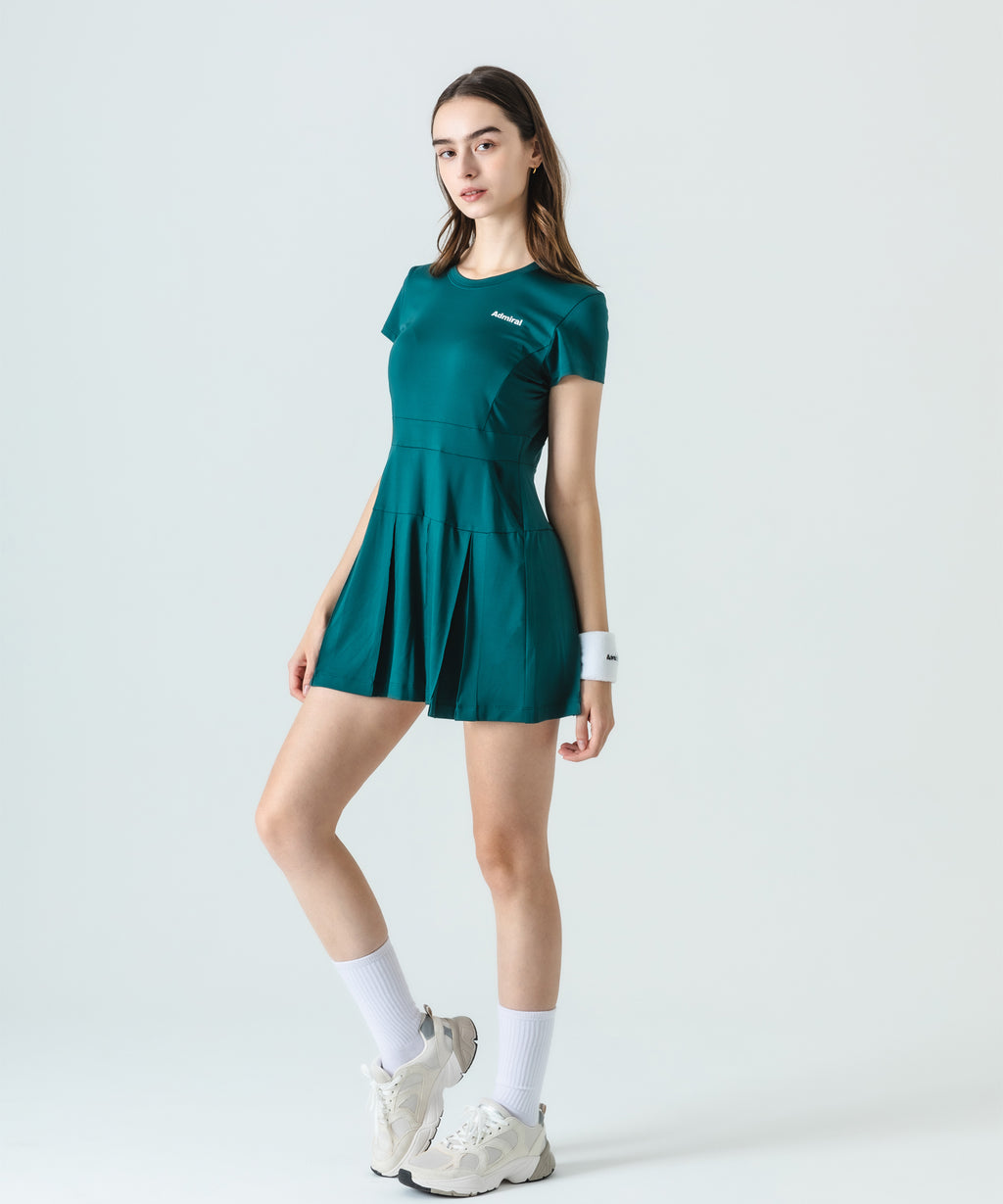 単色使いのシンプルな上品さをデザインした半袖タイプのワンピース。 身頃はパネル切替えで細見えを演出し、裾タックプリーツ仕様で無地でも存在感のあるアイテム。吸水速乾・ストレッチと UVカットの機能を持ちながら、抜群の伸縮性でしなやかな着心地を実現するストレッチ天竺素材を使用。両脇ポケット有り。
