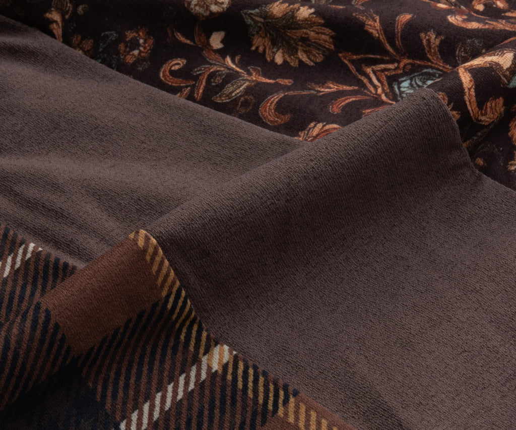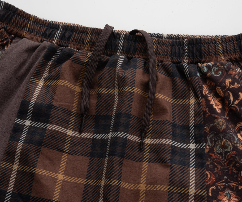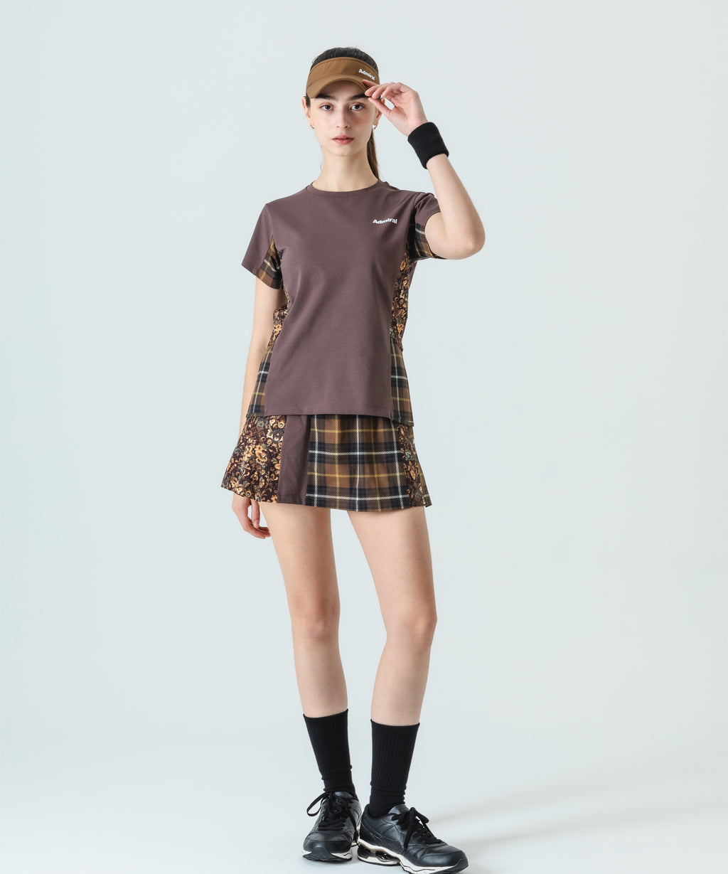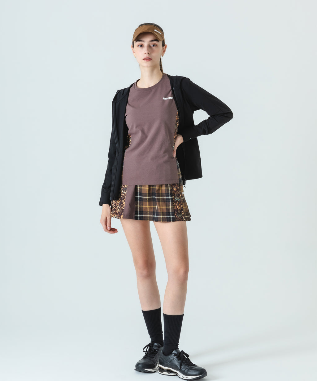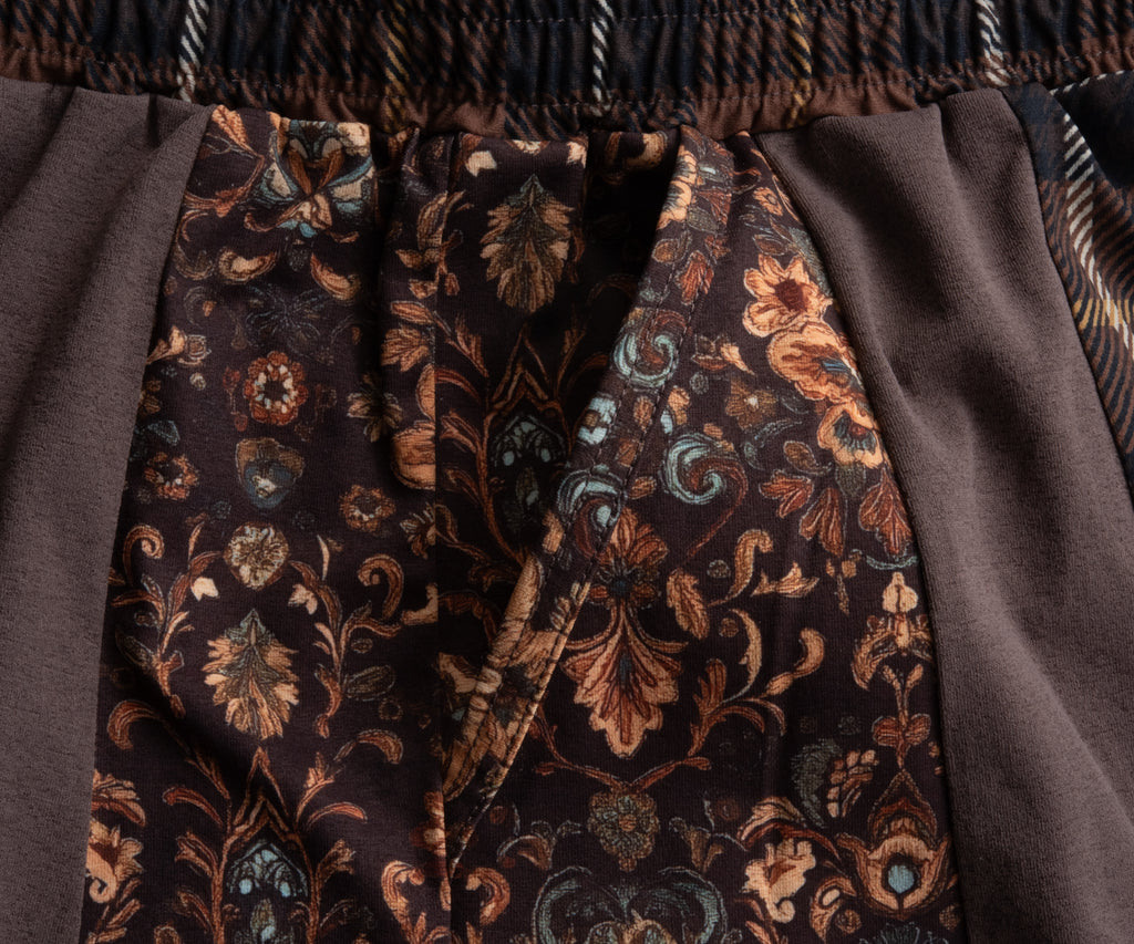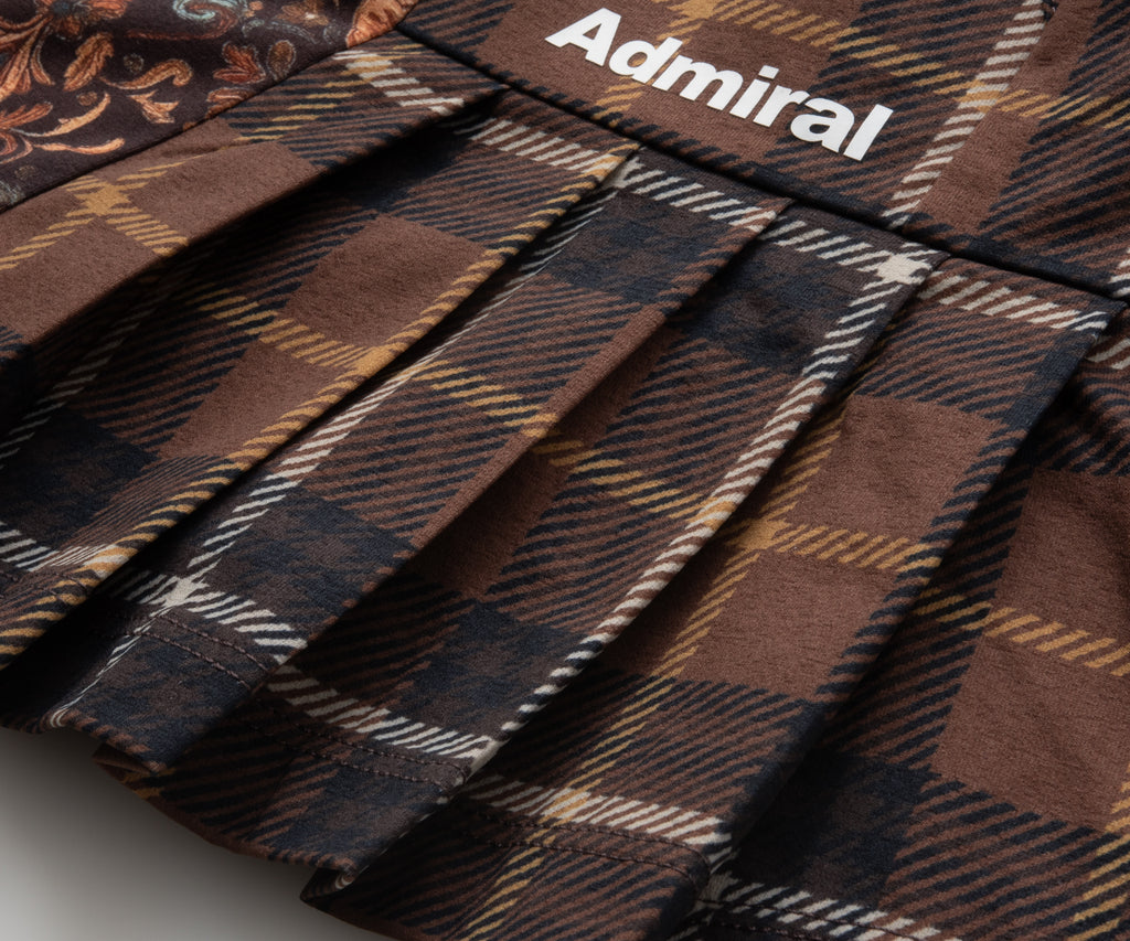 ・チェック柄をベースにダマスク柄と単色を差し込んだ、アシンメトリーな配色遊びのデザインスコート。
