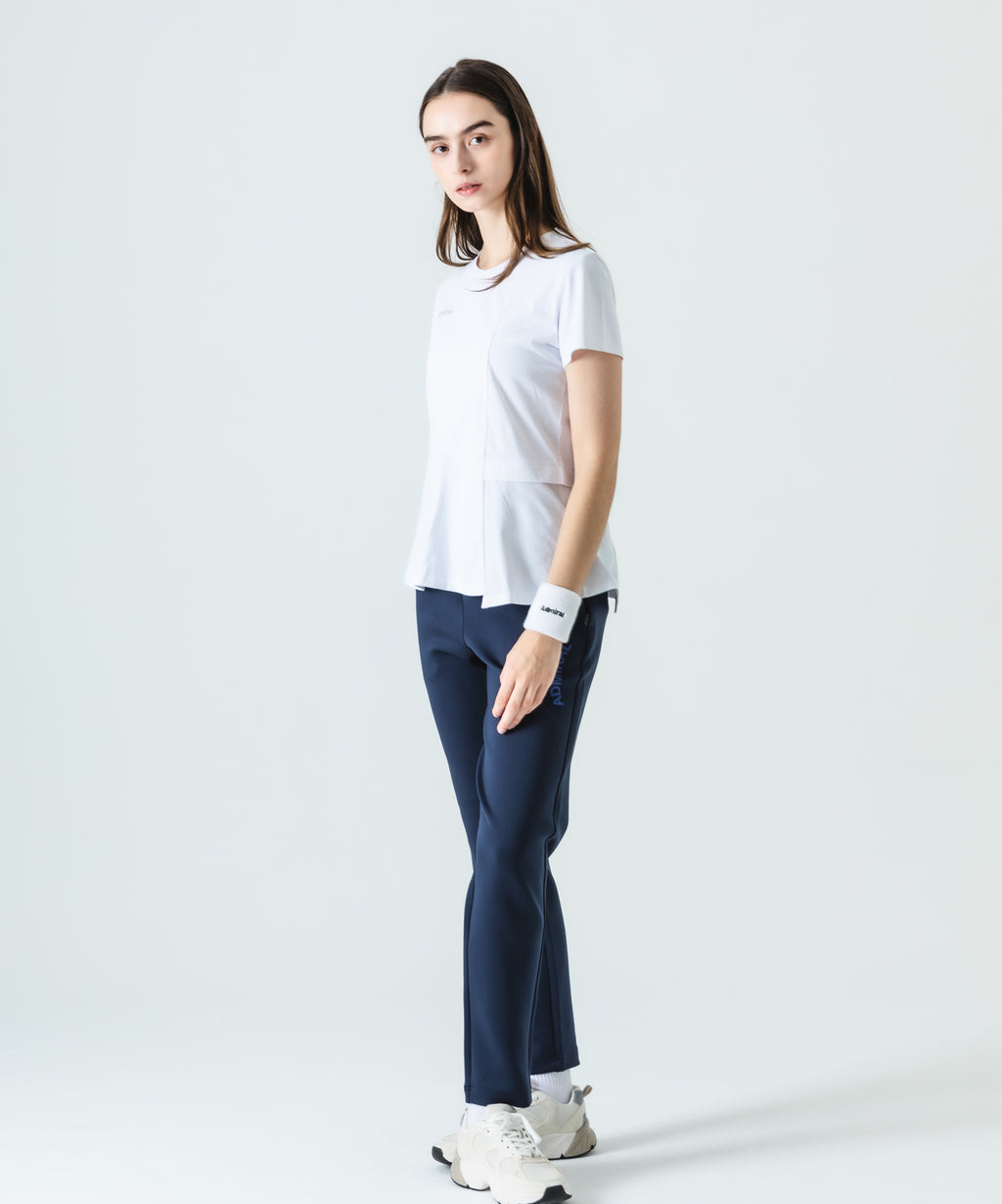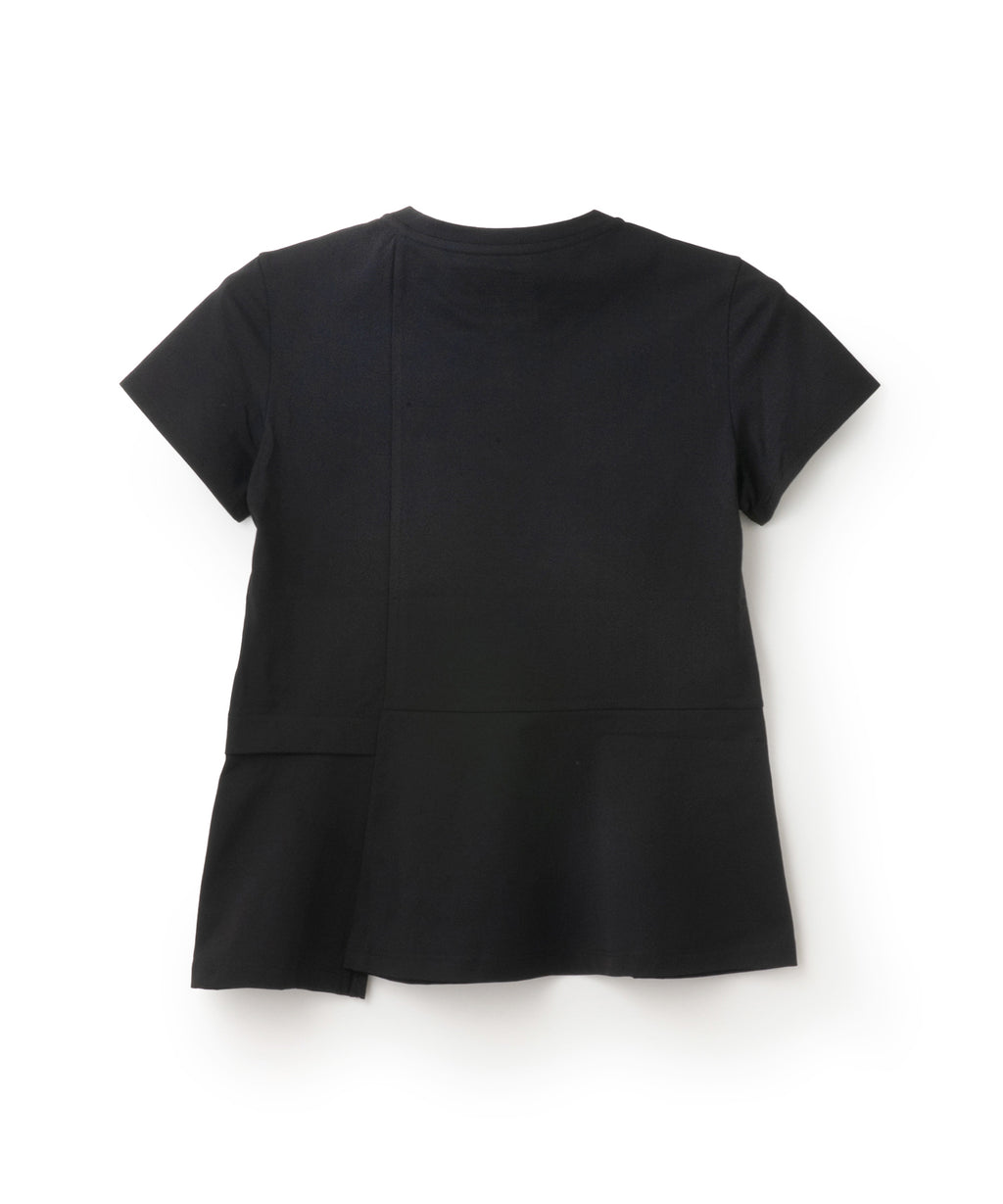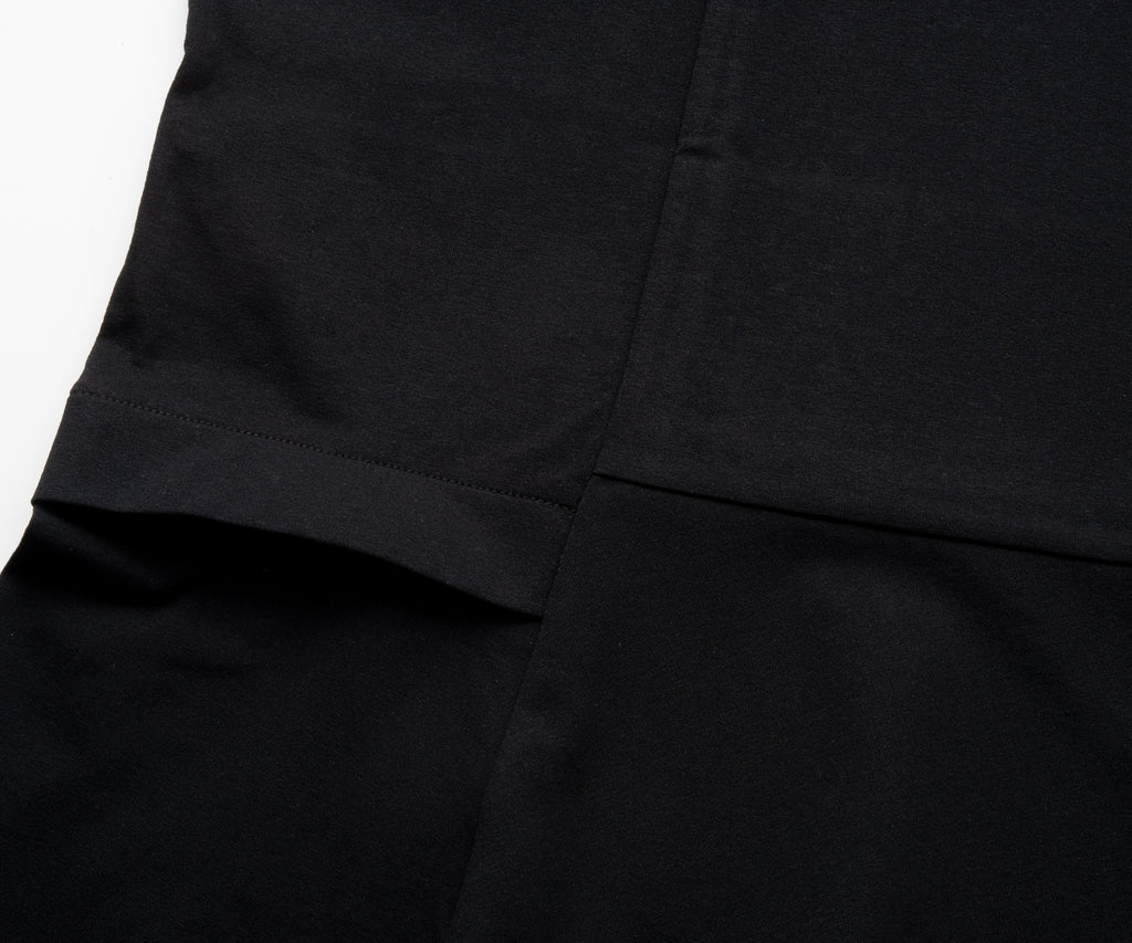 左身頃側に段差をつけたアシンメトリーな裾デザインで、単色ながら個性的な印象のTシャツ。 吸水速乾性に優れたコットンライクで柔らかい風合いと素朴なハリ感のある伸縮素材。