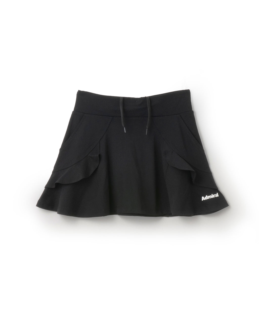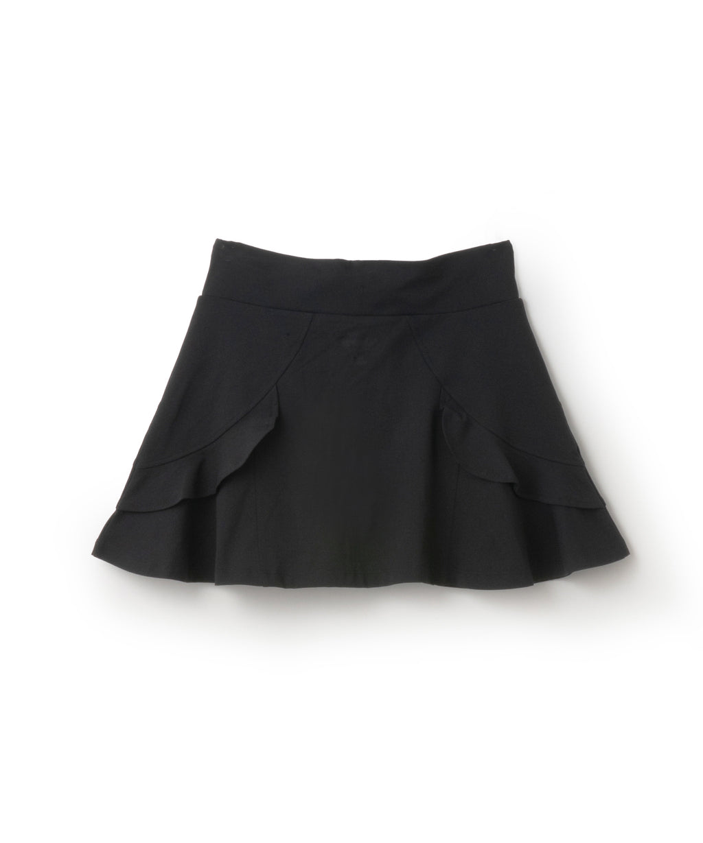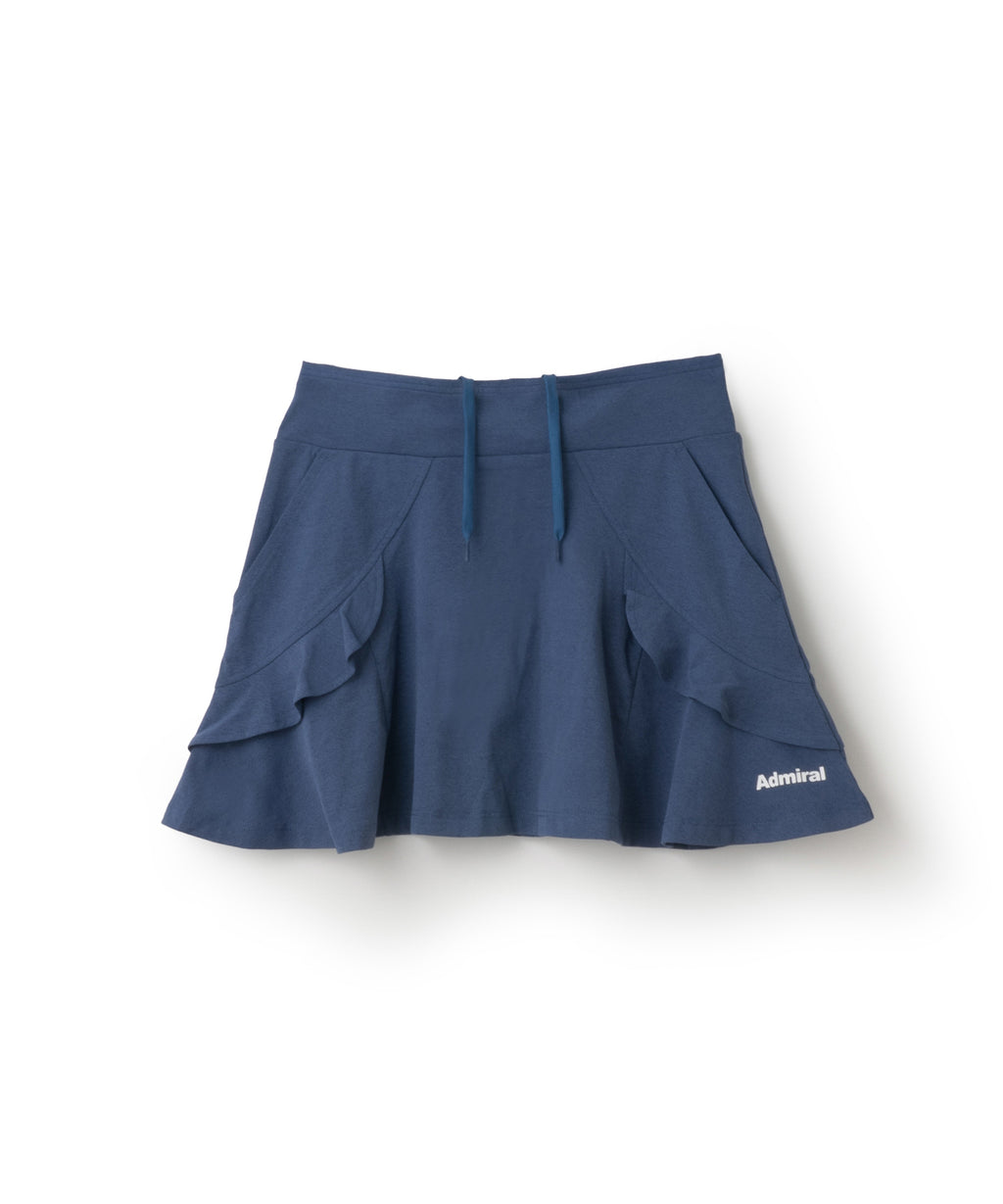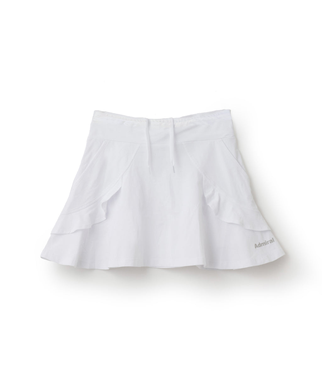 アーチ切替えに挟んだミニフリルが愛らしいデザインで、単色で使いやすさを重視したスコート。 吸水速乾性に優れたコットンライクで柔らかい風合いと素朴なハリ感のある伸縮素材。 フラットウエストタイプ、ウエストゴム入り、ウエスト紐有り、前両脇ポケット仕様。