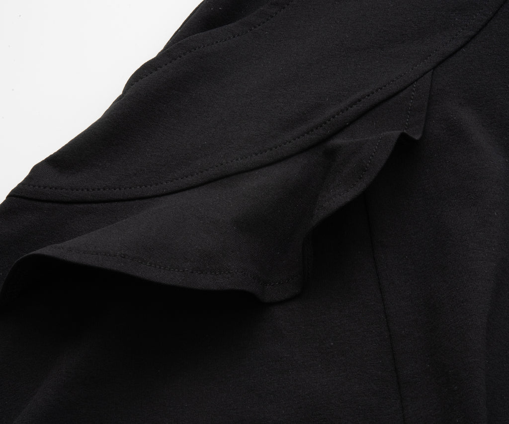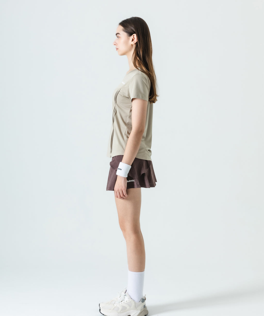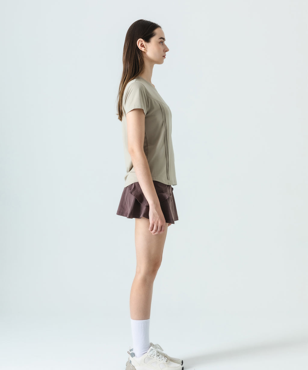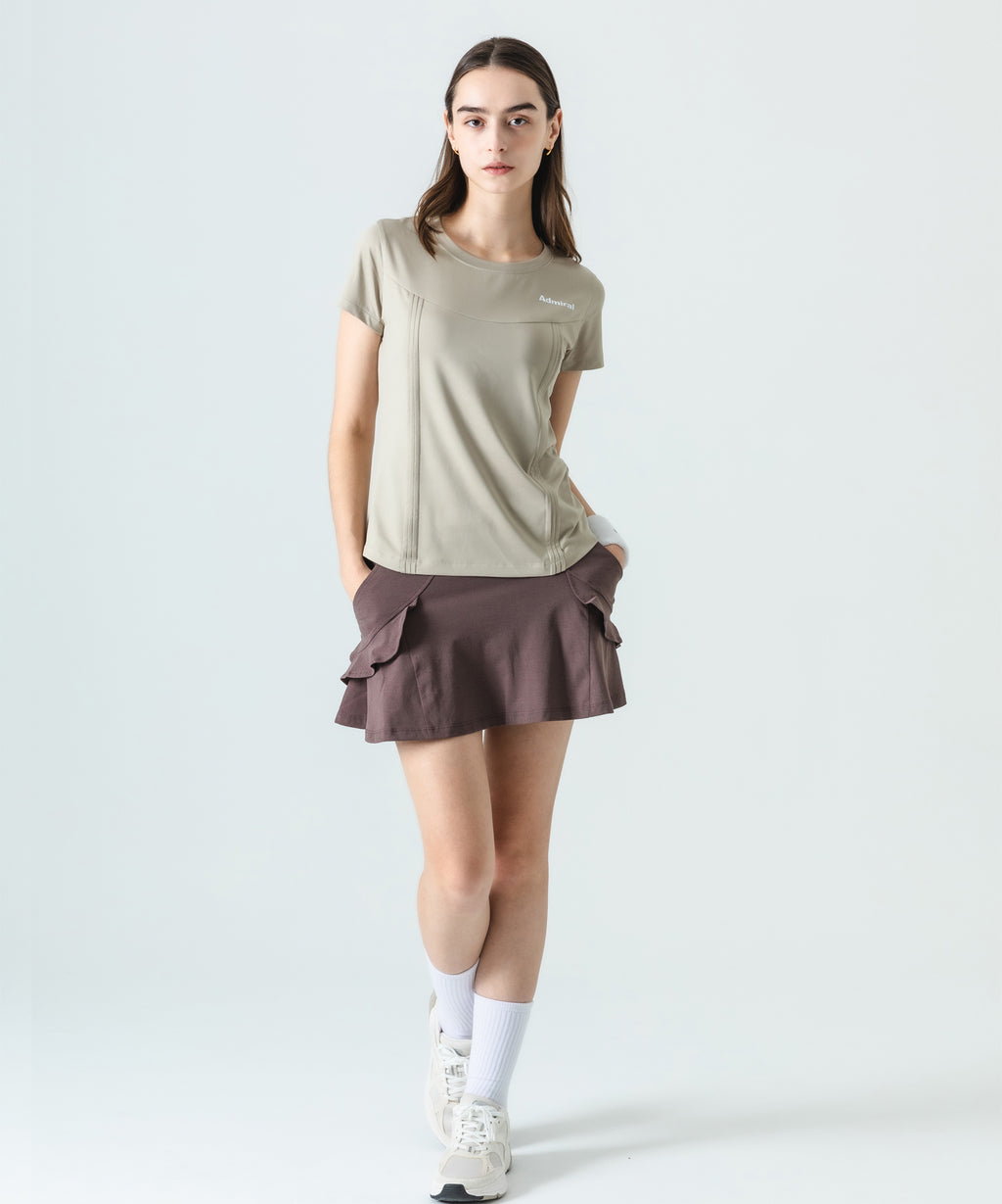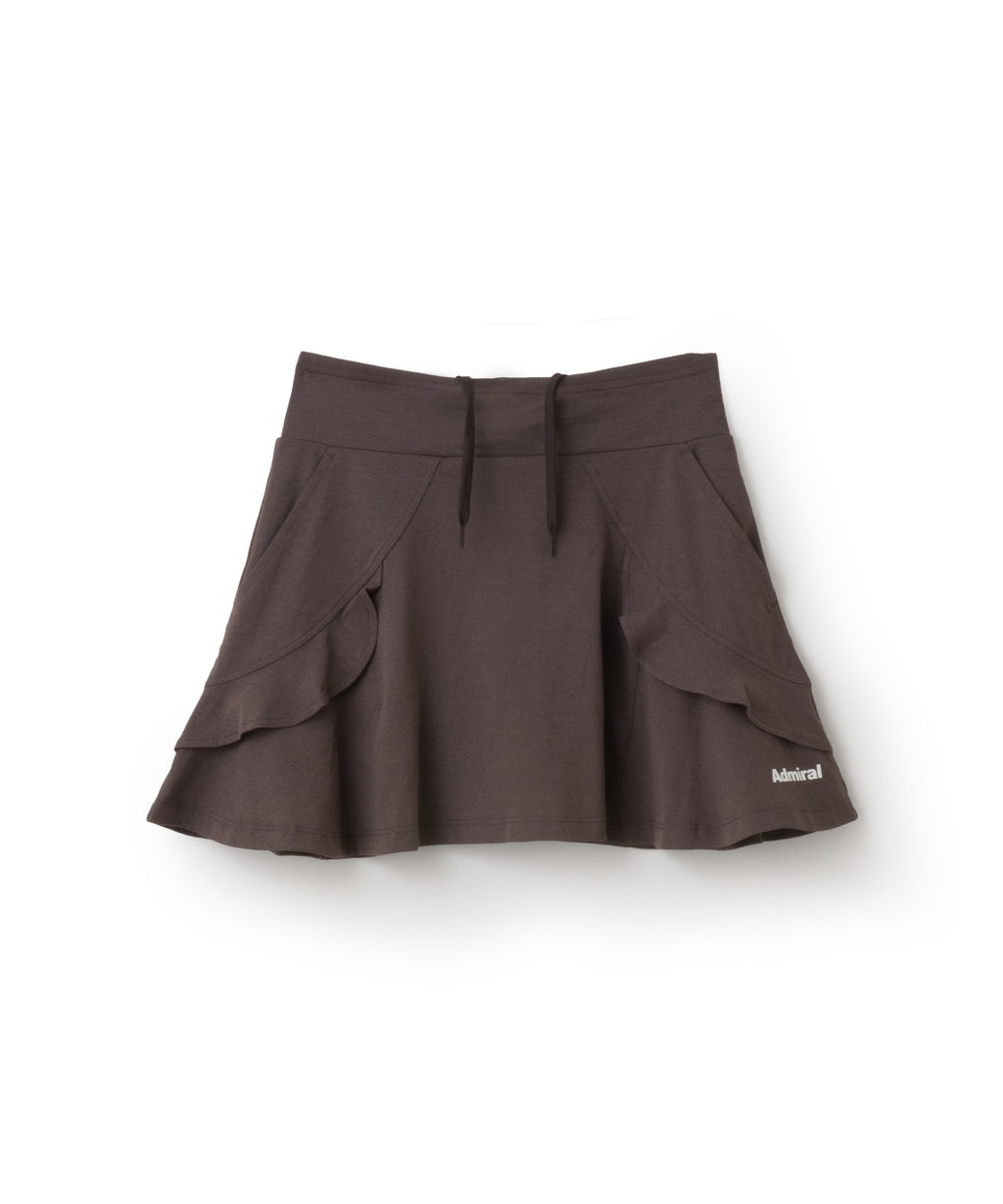 アーチ切替えに挟んだミニフリルが愛らしいデザインで、単色で使いやすさを重視したスコート。 吸水速乾性に優れたコットンライクで柔らかい風合いと素朴なハリ感のある伸縮素材。 フラットウエストタイプ、ウエストゴム入り、ウエスト紐有り、前両脇ポケット仕様。