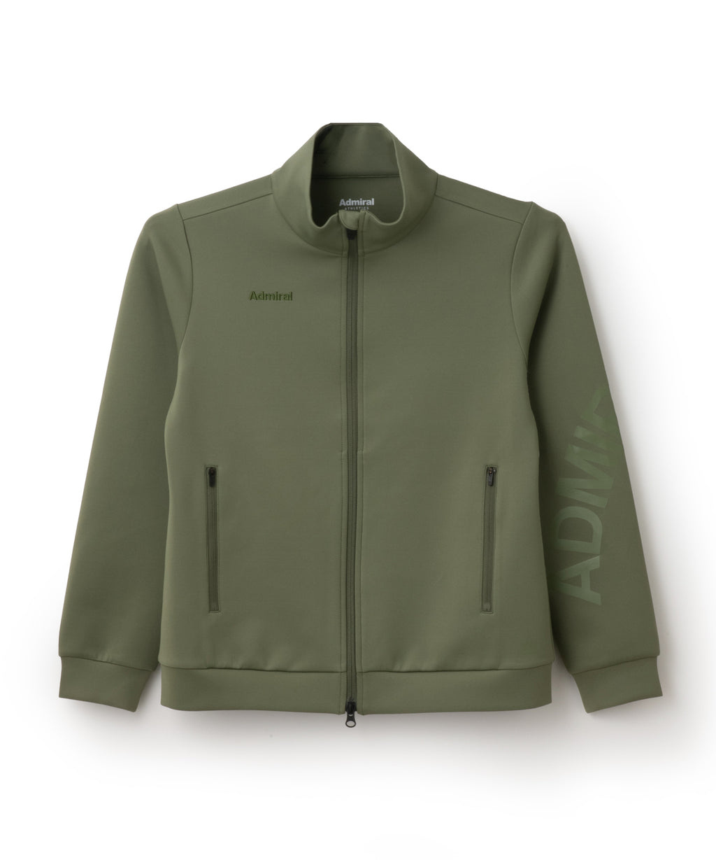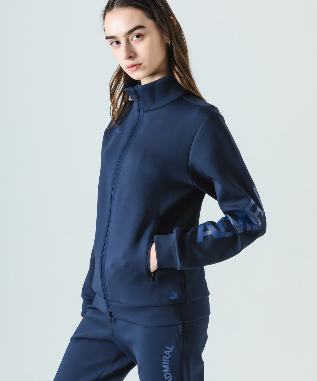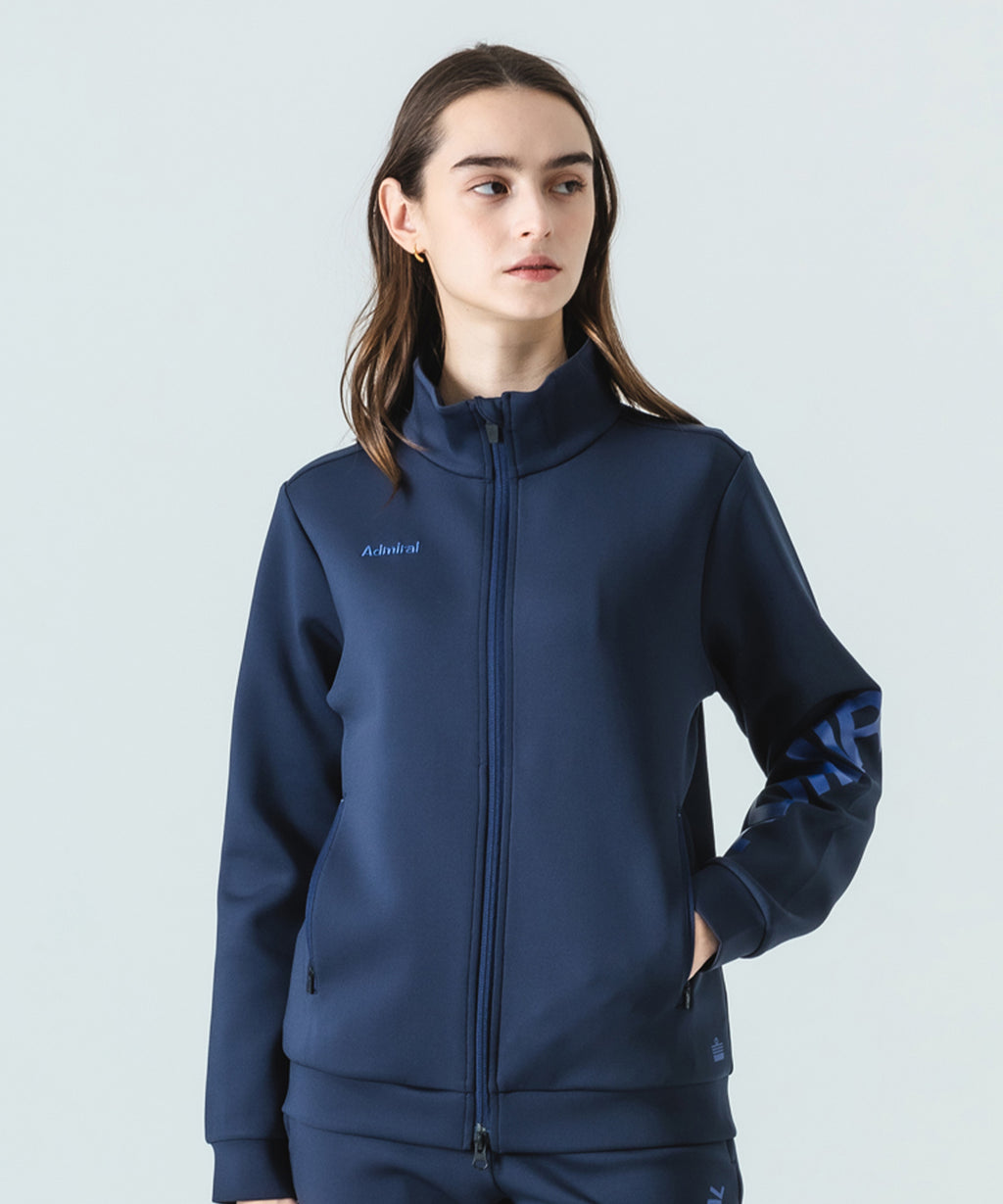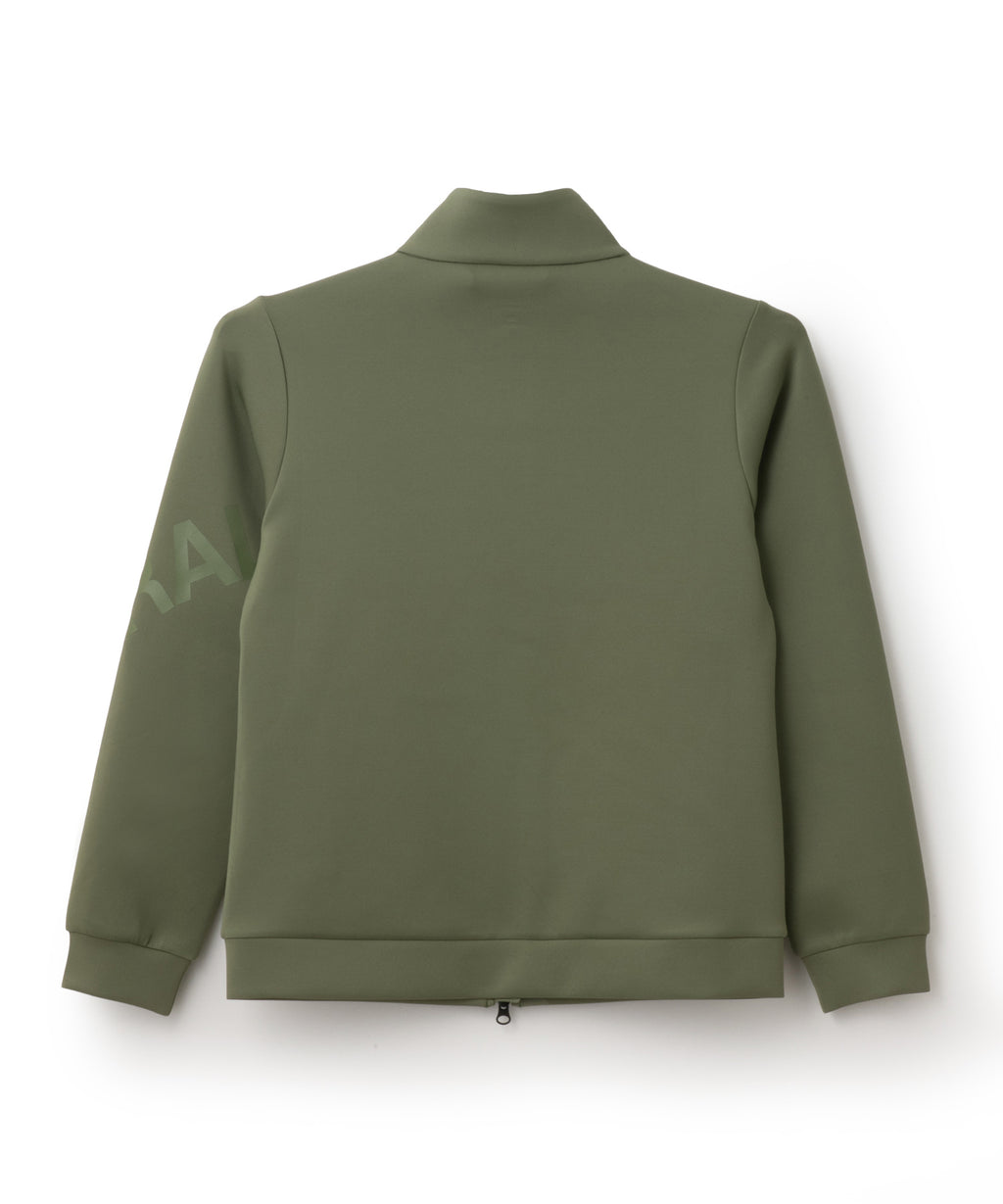 ・なめらかなダンボールニット素材を使用した、袖のアーチロゴがポイントのジャケット。_