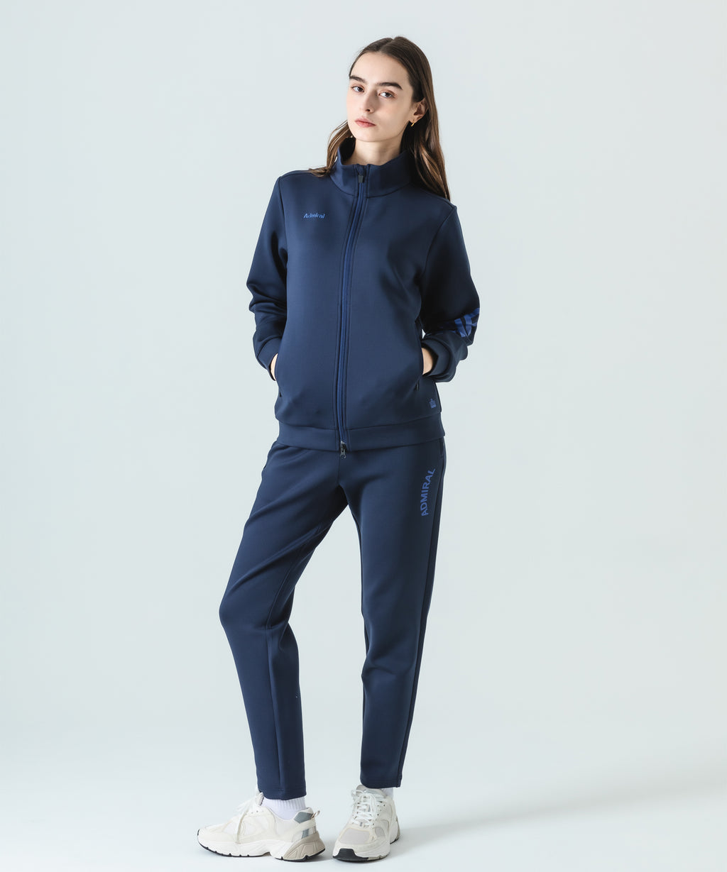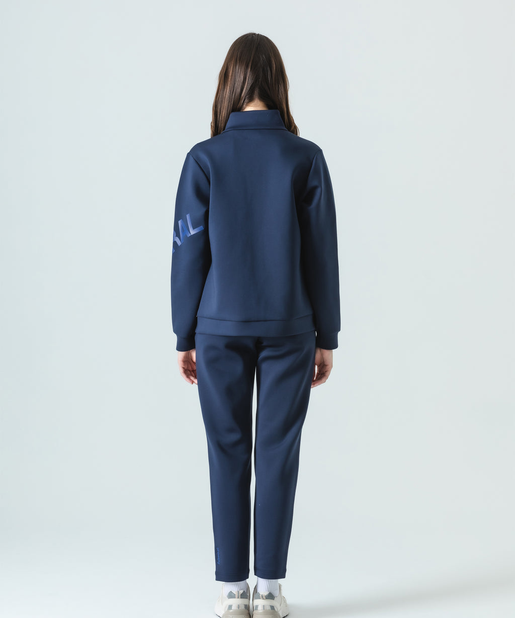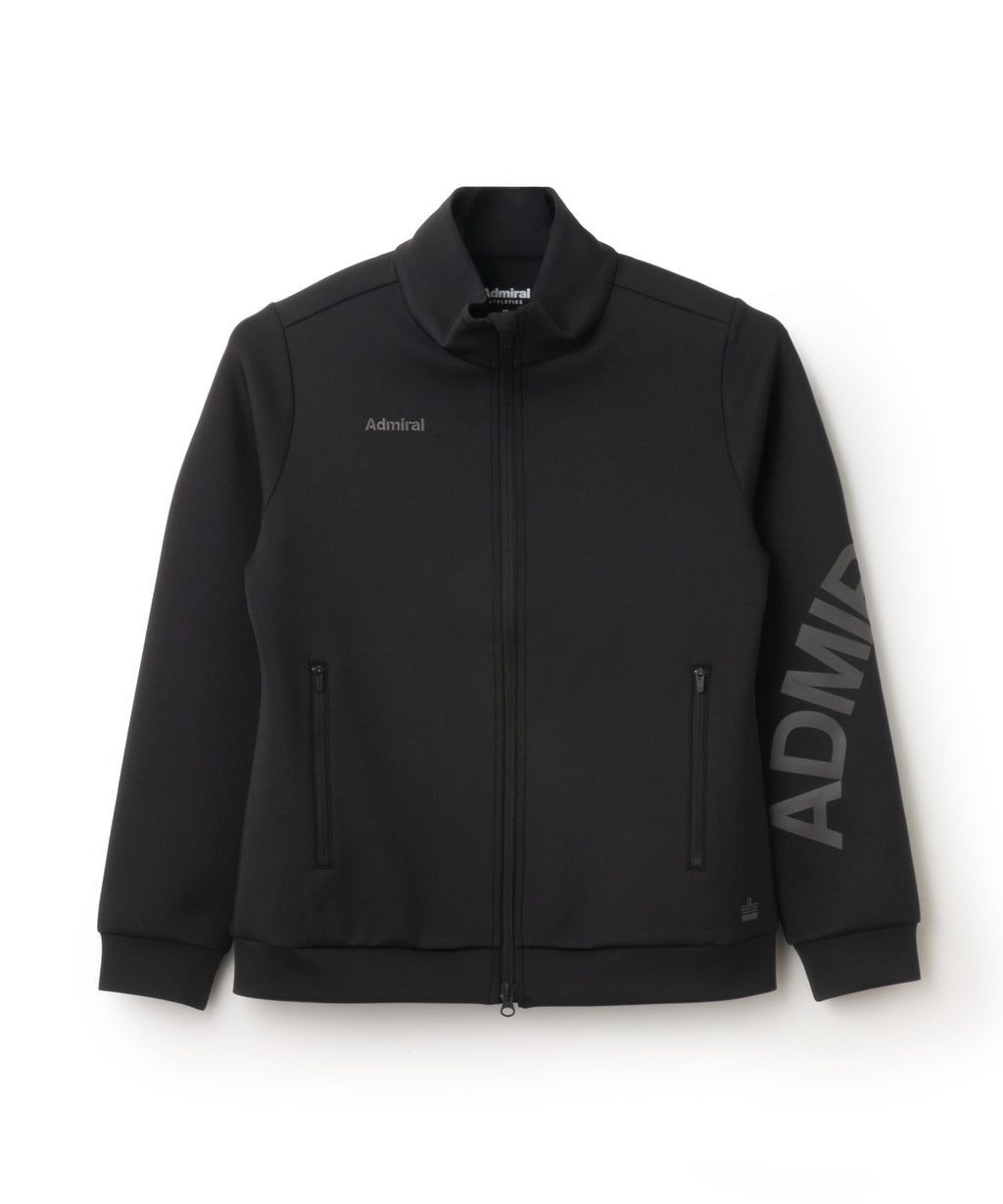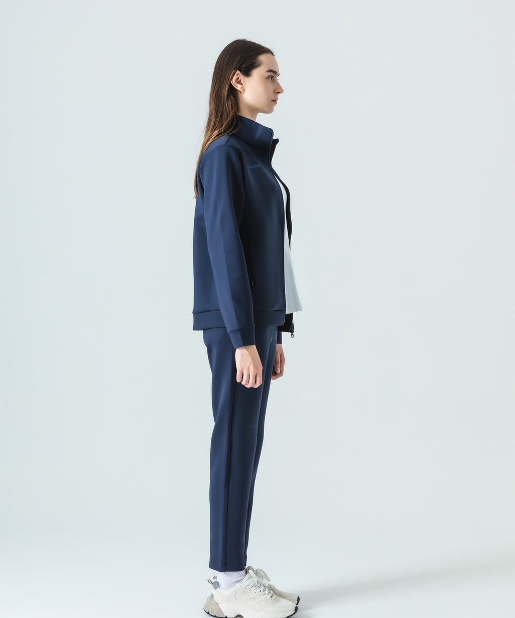 ・なめらかなダンボールニット素材を使用した、袖のアーチロゴがポイントのジャケット。_