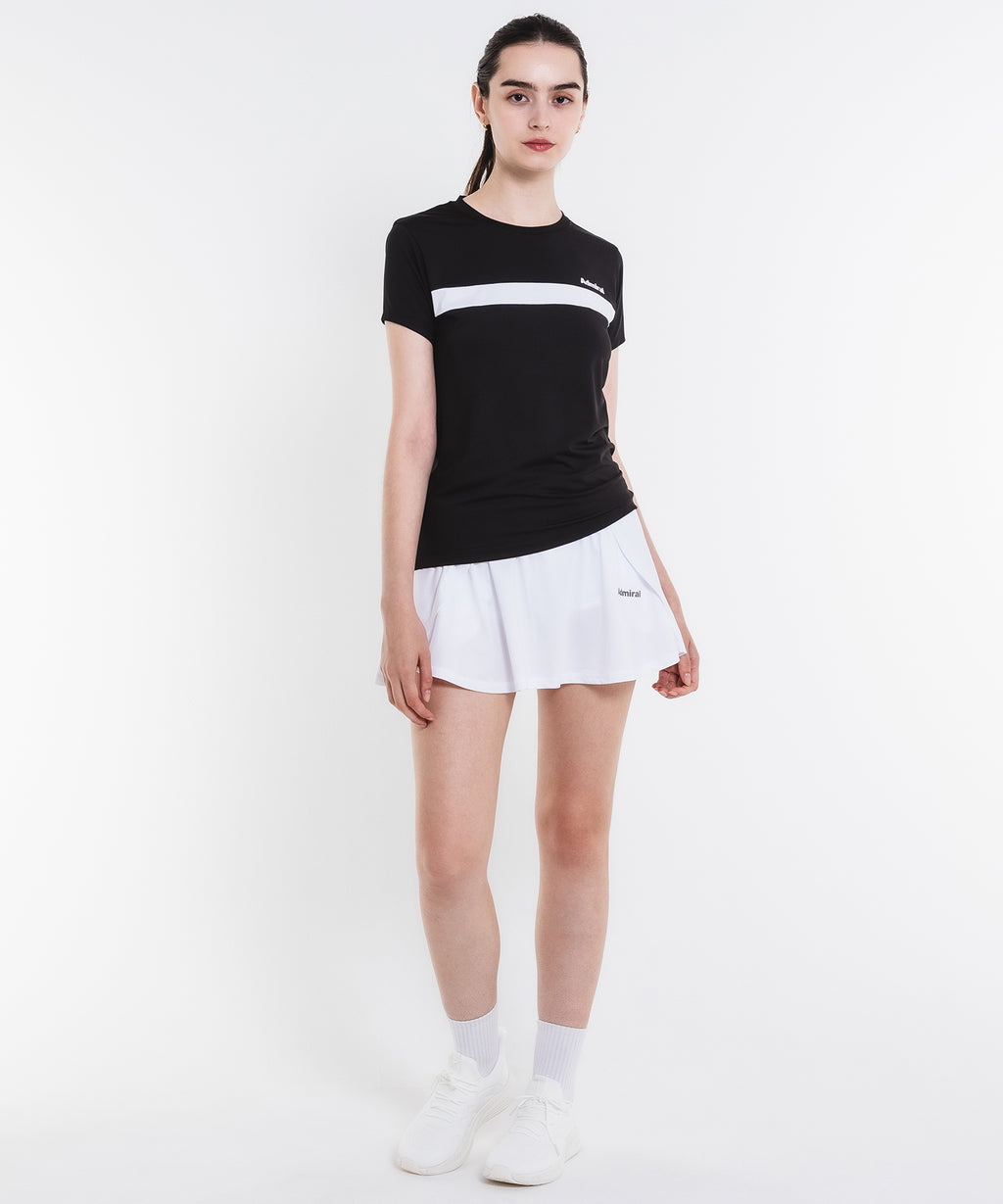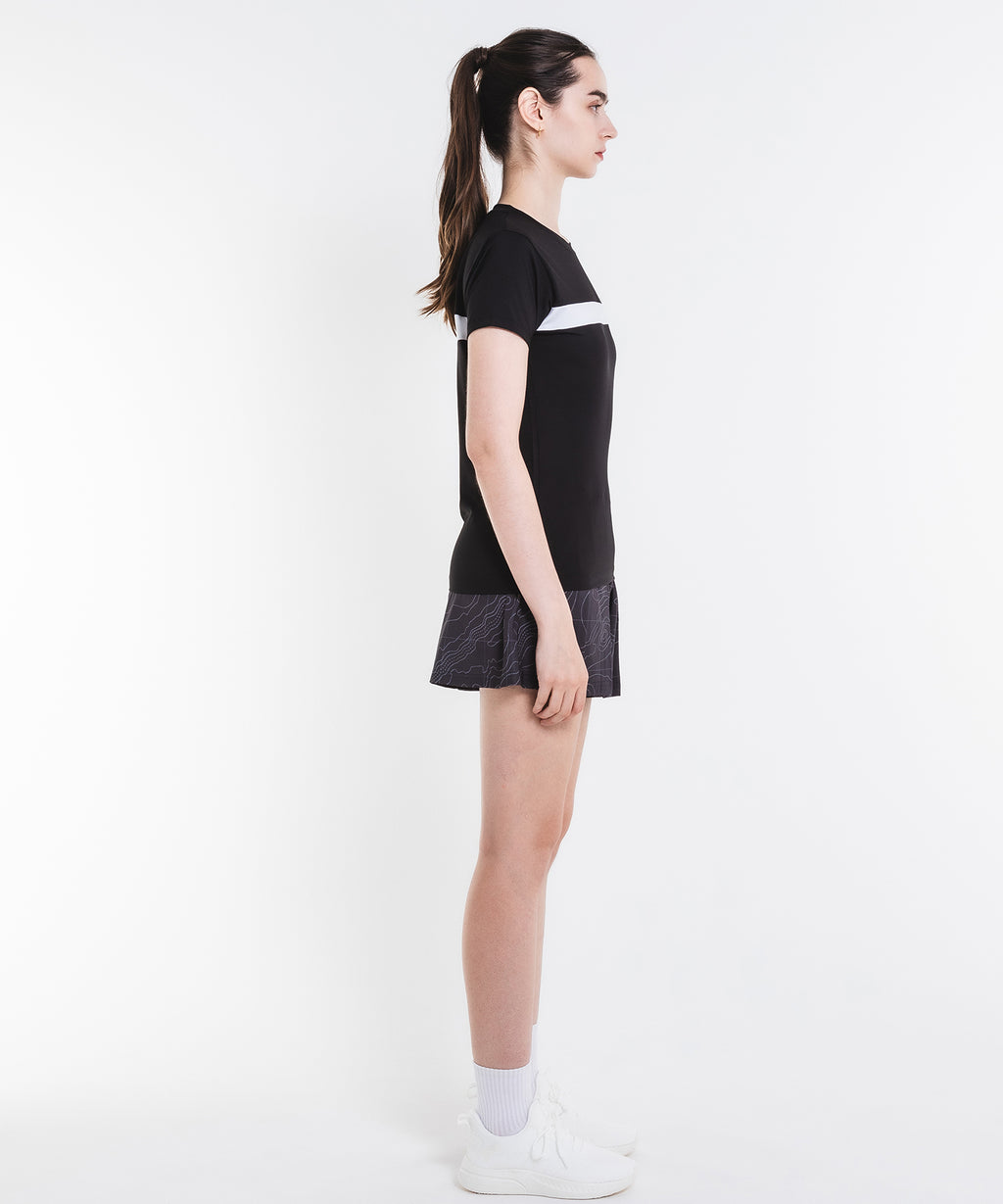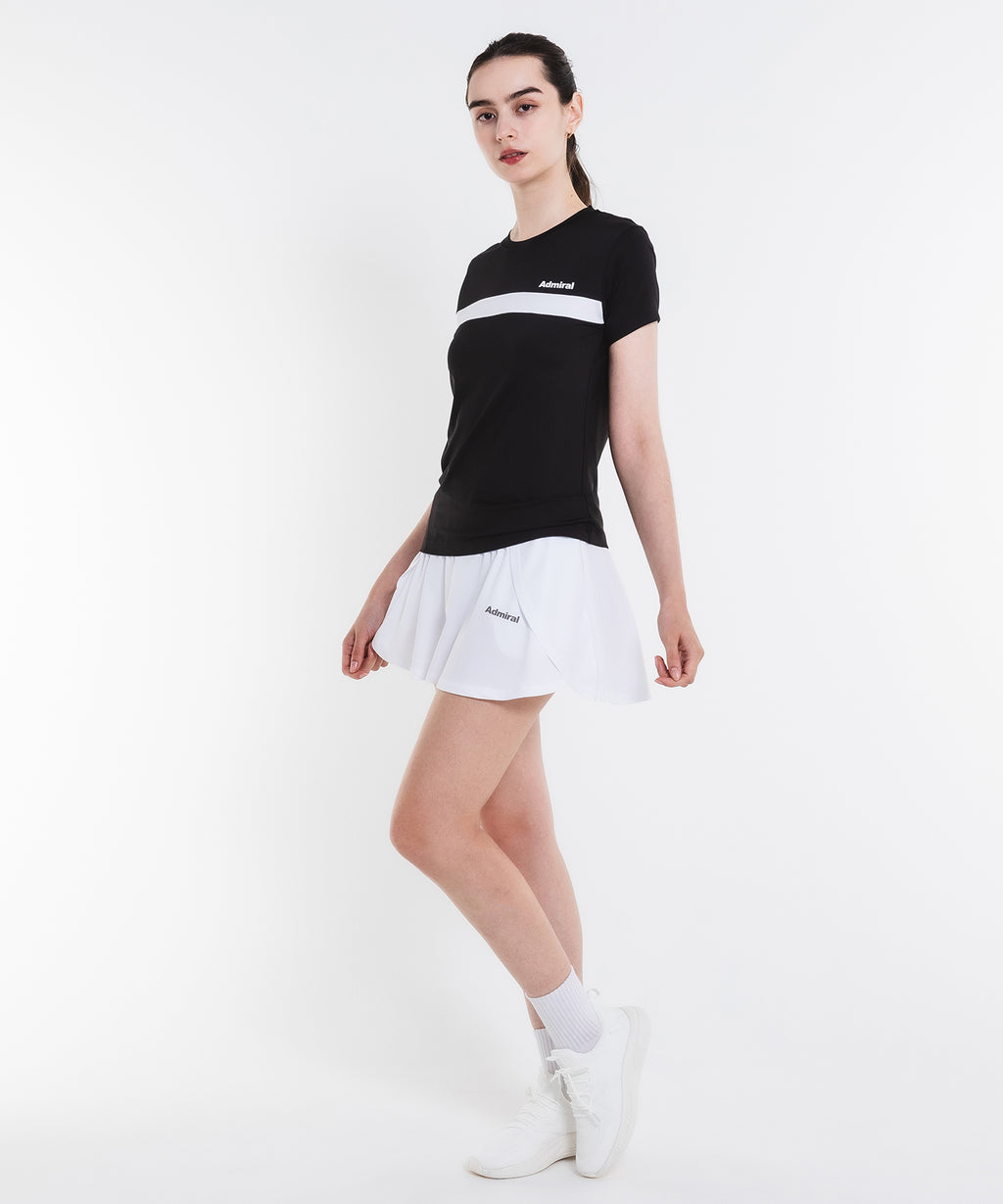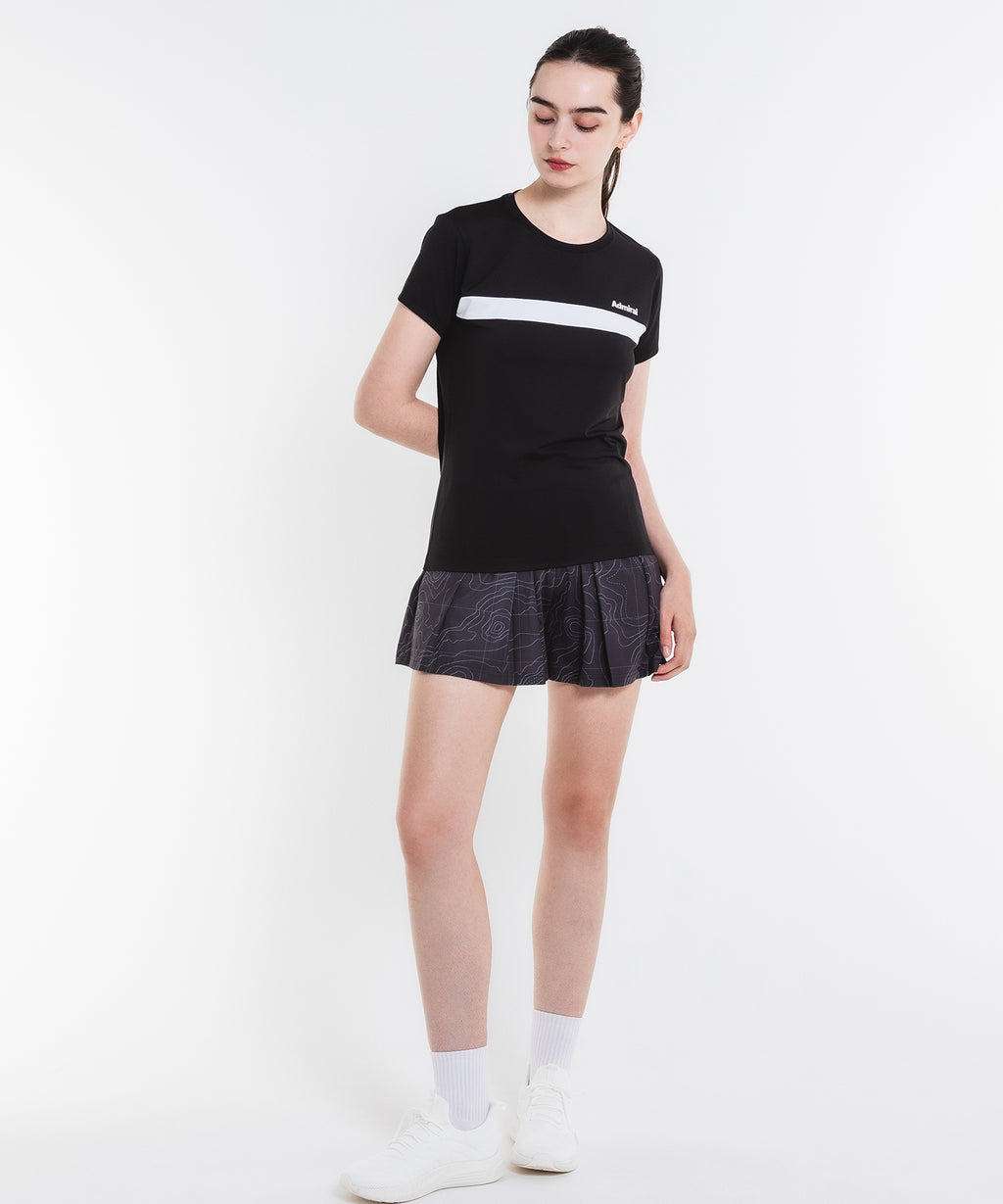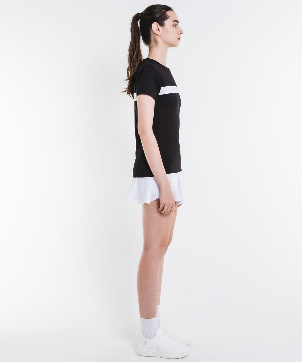 フロントのシンプルな細ライン切替の無地ベースのバイカラーTシャツ。吸水速乾とUVカットの機能を持ちながら、とろみのある抜群の伸縮性でしなやかな着心地を実現する定番のストレッチ天竺素材を使用。