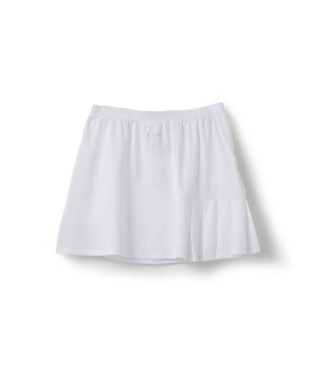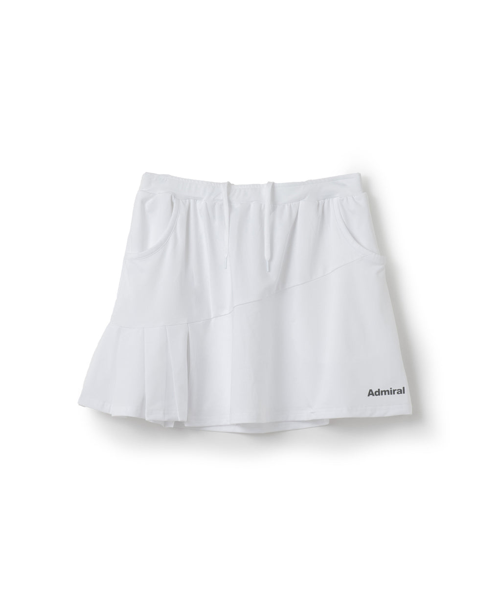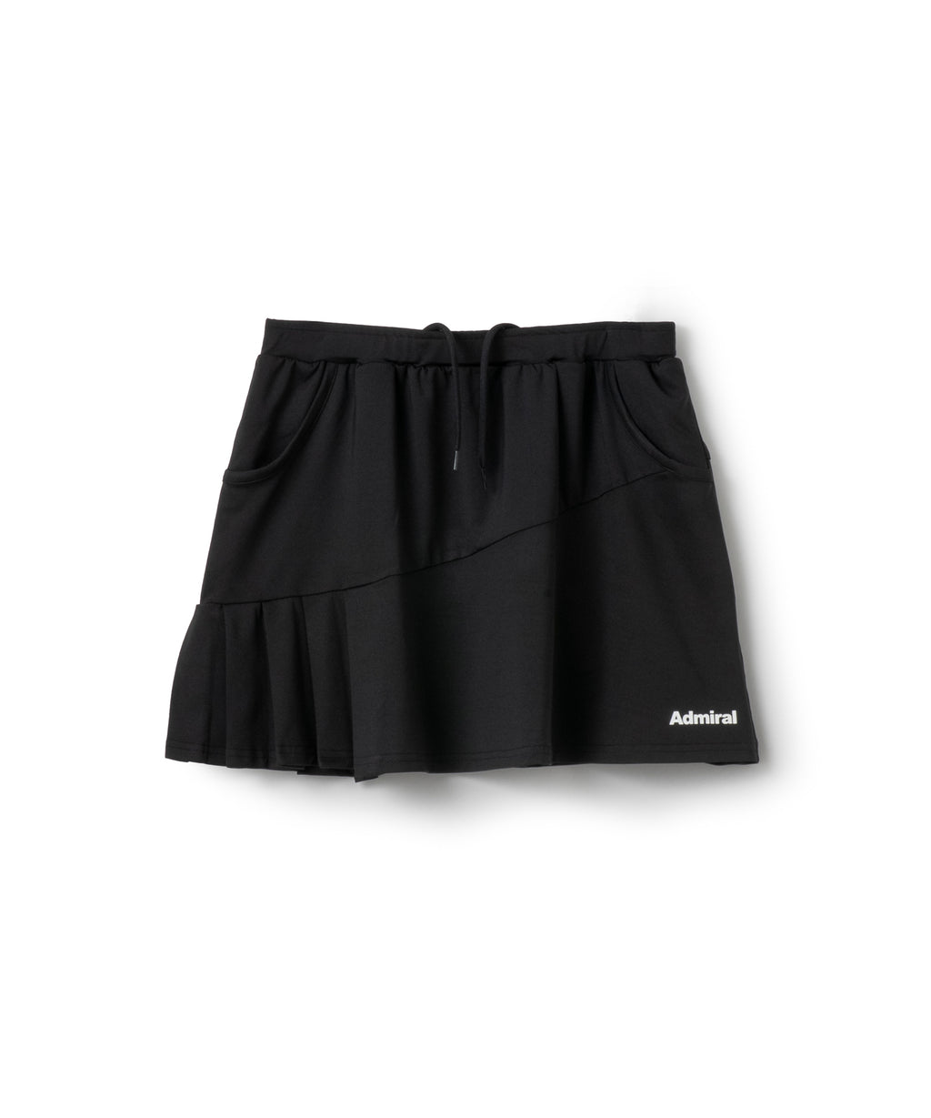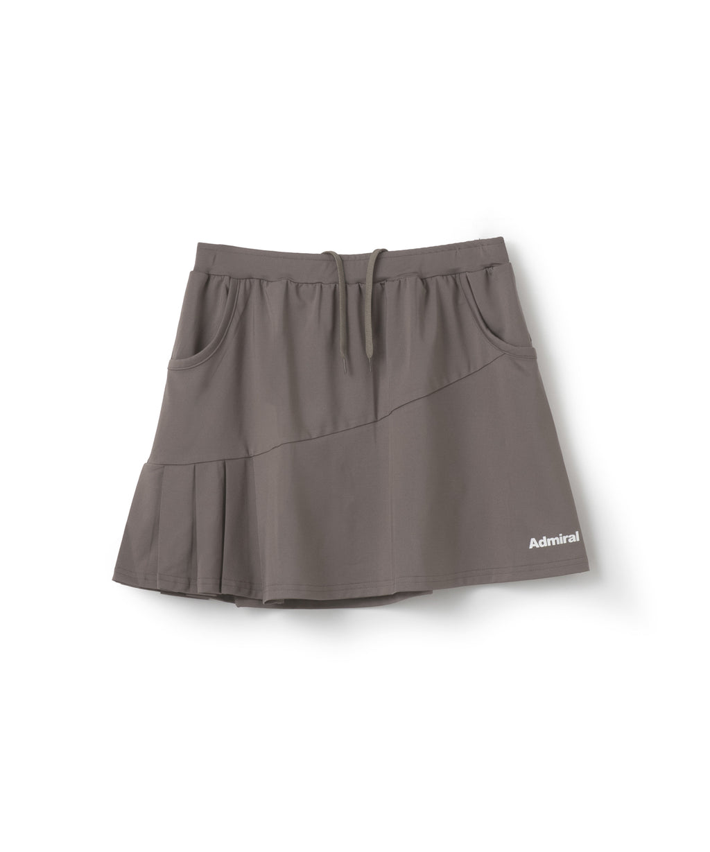 斜めの切替と片側プリーツのアシンメトリーデザインのスコート。着回しやすい単色カラー。吸水速乾とUVカットの機能を持ちながら、とろみのある抜群の伸縮性でしなやかな着心地を実現する定番のストレッチ天竺素材を使用。両脇ポケット、ウエスト紐調整有り。