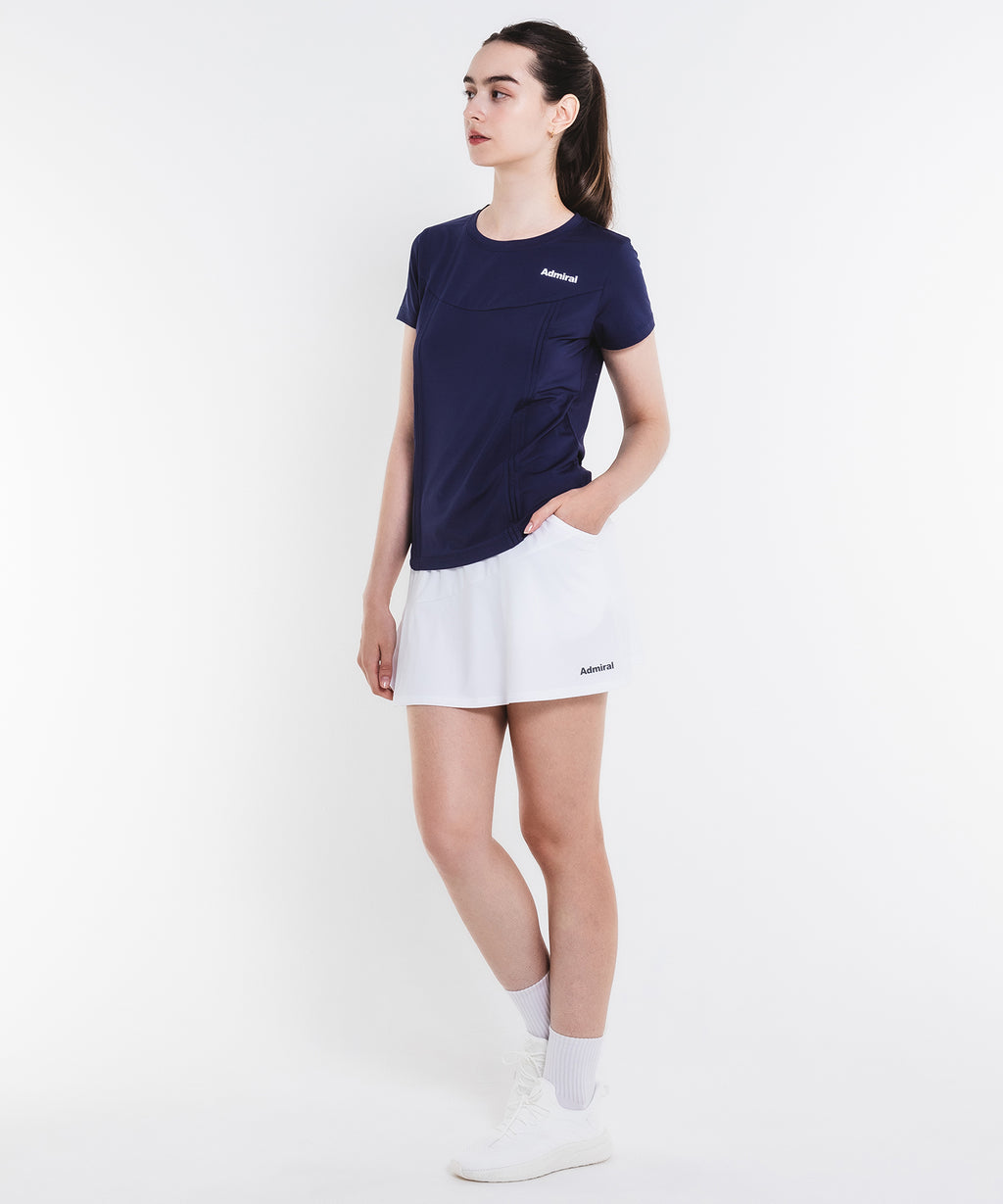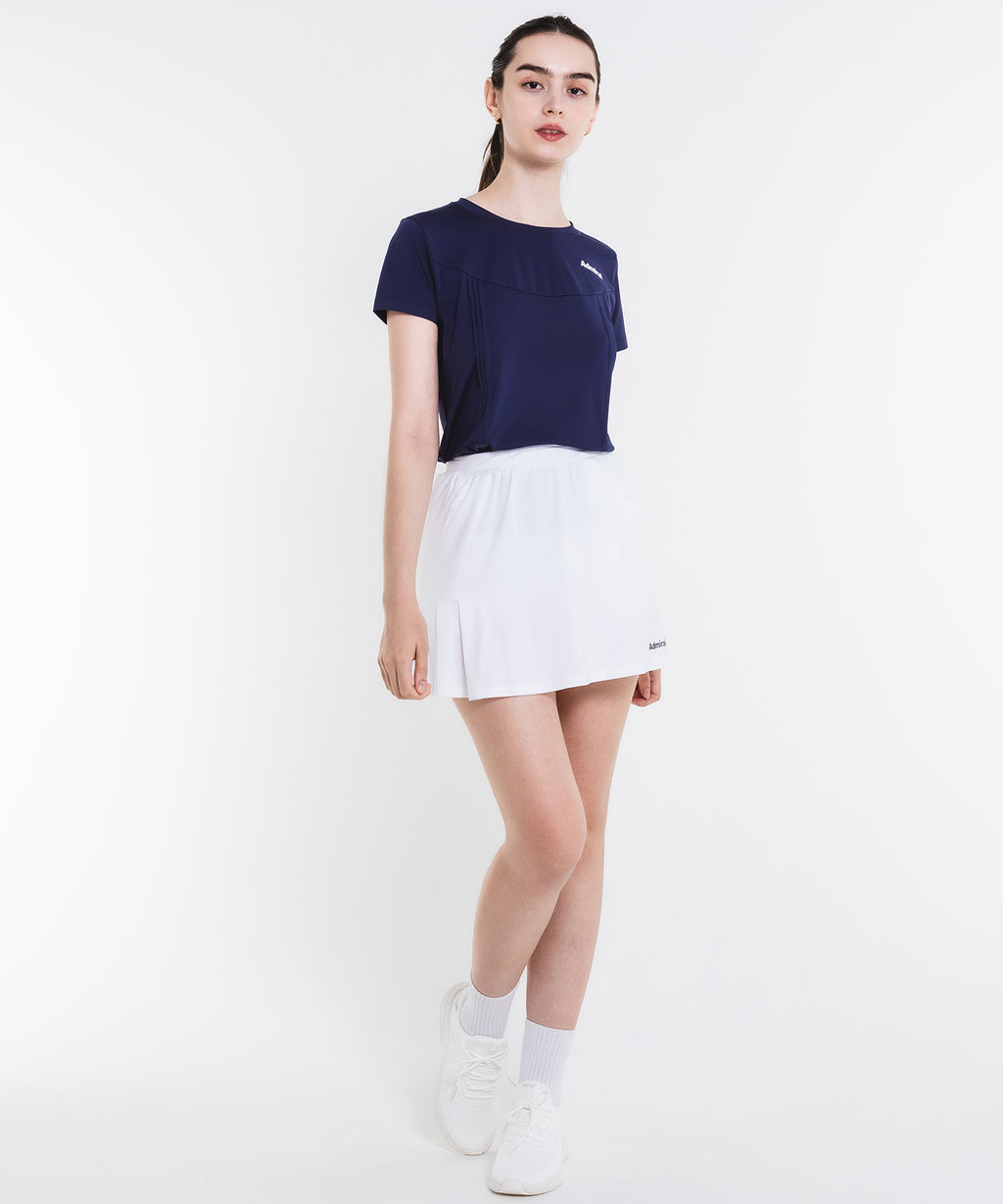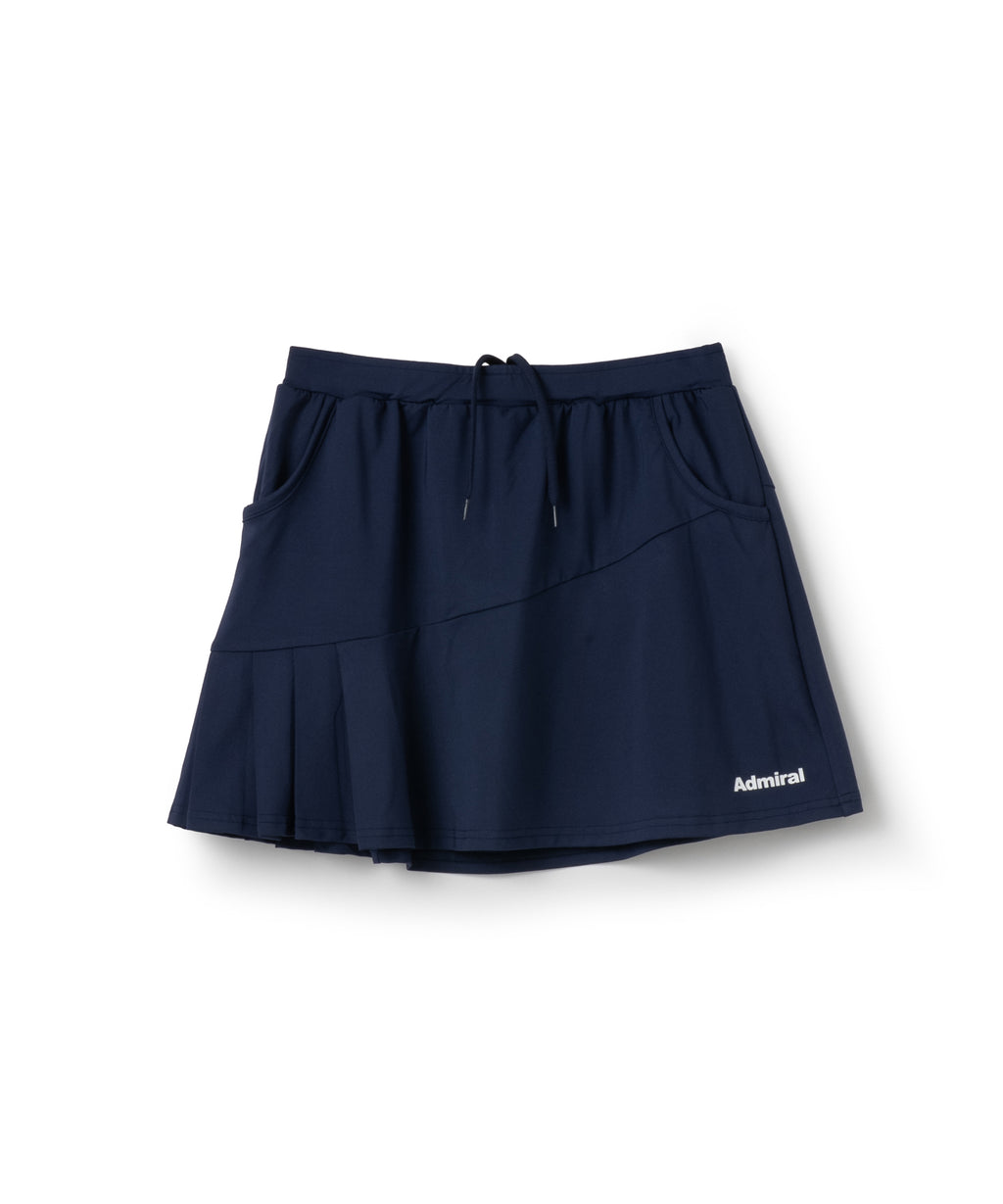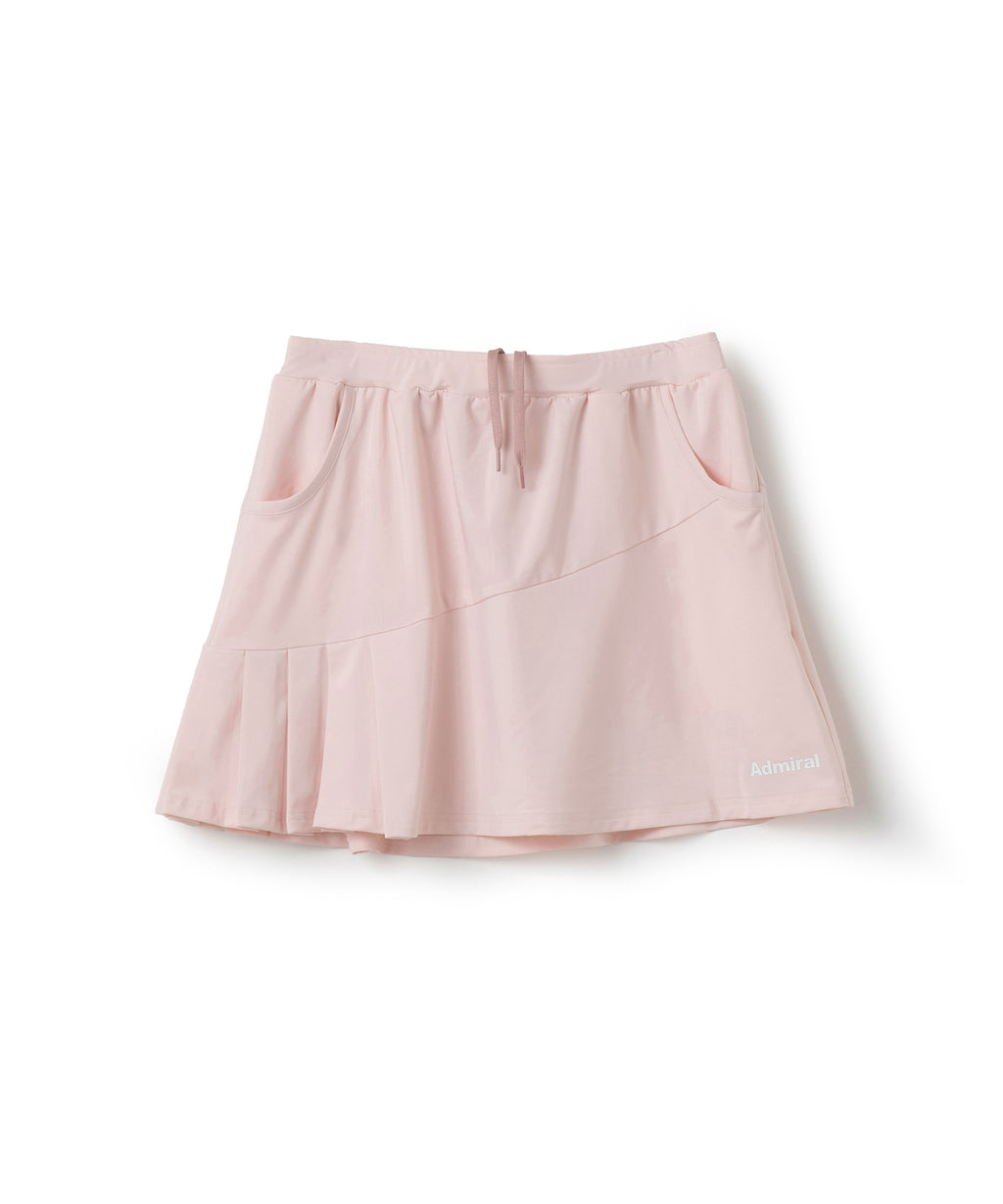 斜めの切替と片側プリーツのアシンメトリーデザインのスコート。着回しやすい単色カラー。吸水速乾とUVカットの機能を持ちながら、とろみのある抜群の伸縮性でしなやかな着心地を実現する定番のストレッチ天竺素材を使用。両脇ポケット、ウエスト紐調整有り。
