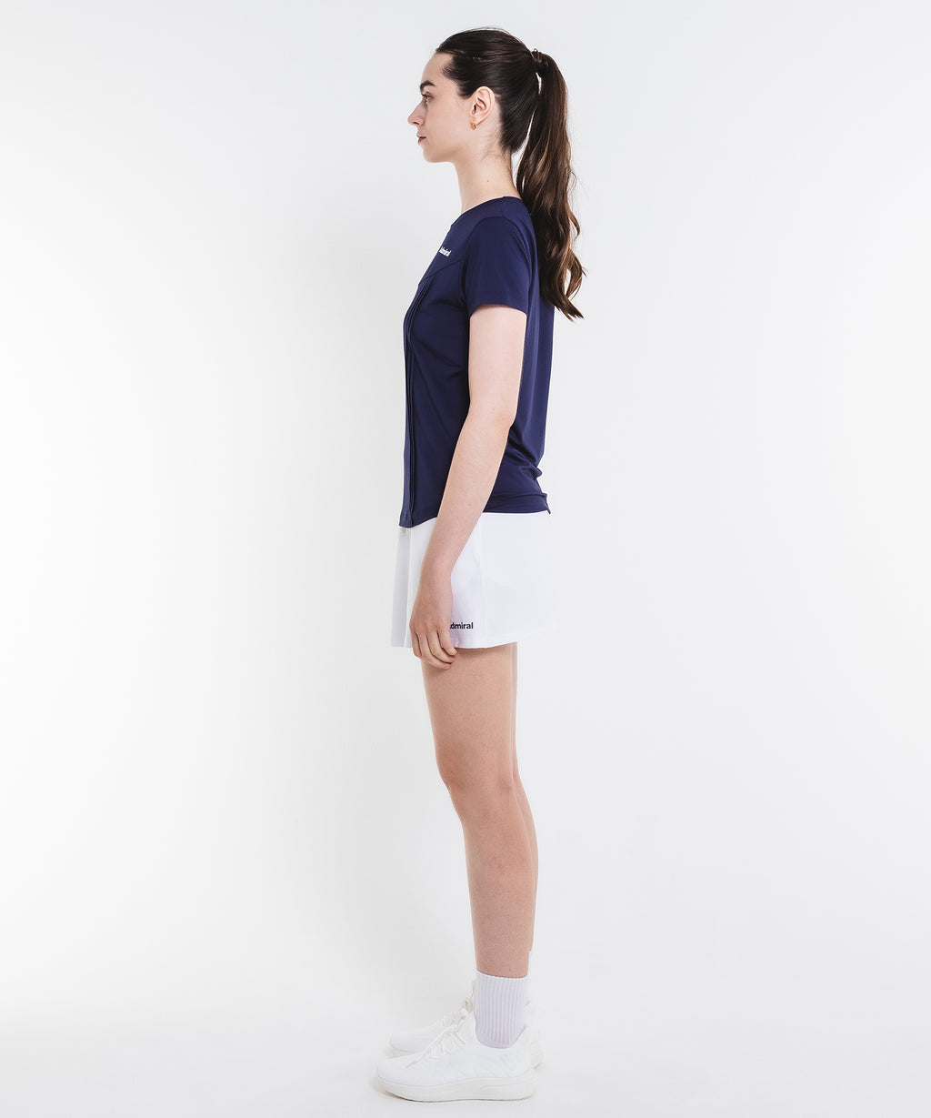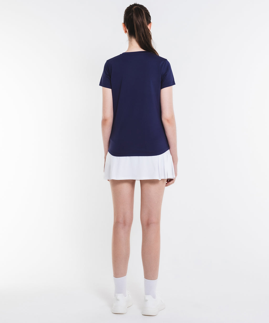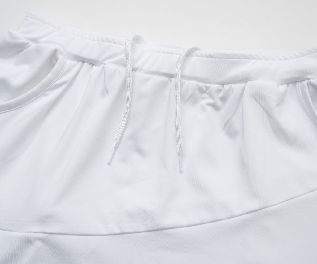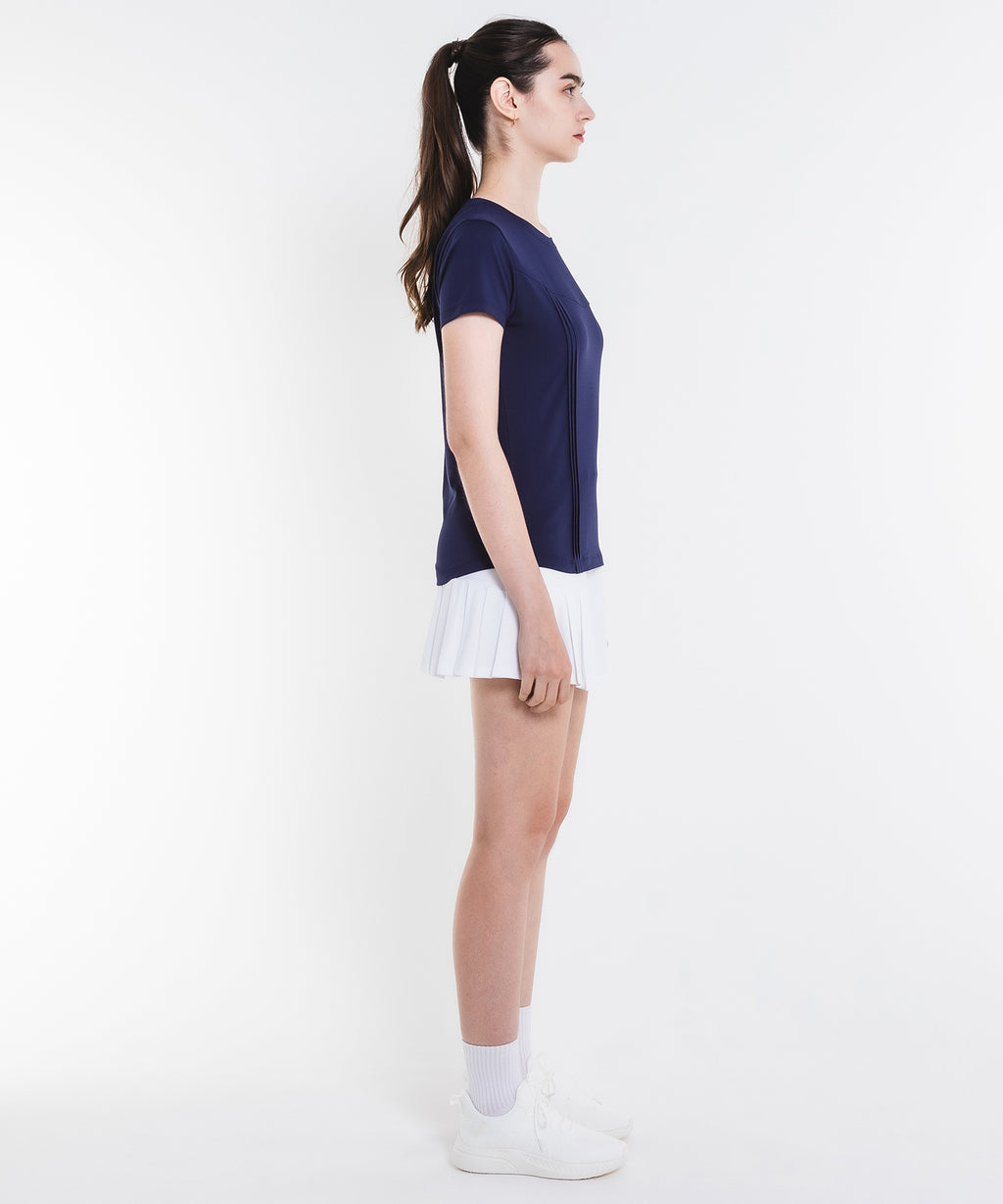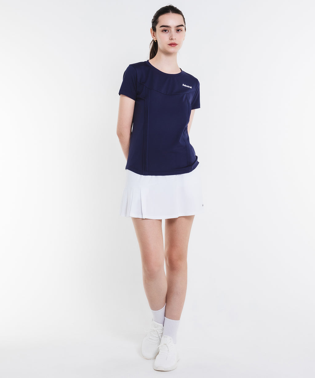 斜めの切替と片側プリーツのアシンメトリーデザインのスコート。着回しやすい単色カラー。吸水速乾とUVカットの機能を持ちながら、とろみのある抜群の伸縮性でしなやかな着心地を実現する定番のストレッチ天竺素材を使用。両脇ポケット、ウエスト紐調整有り。