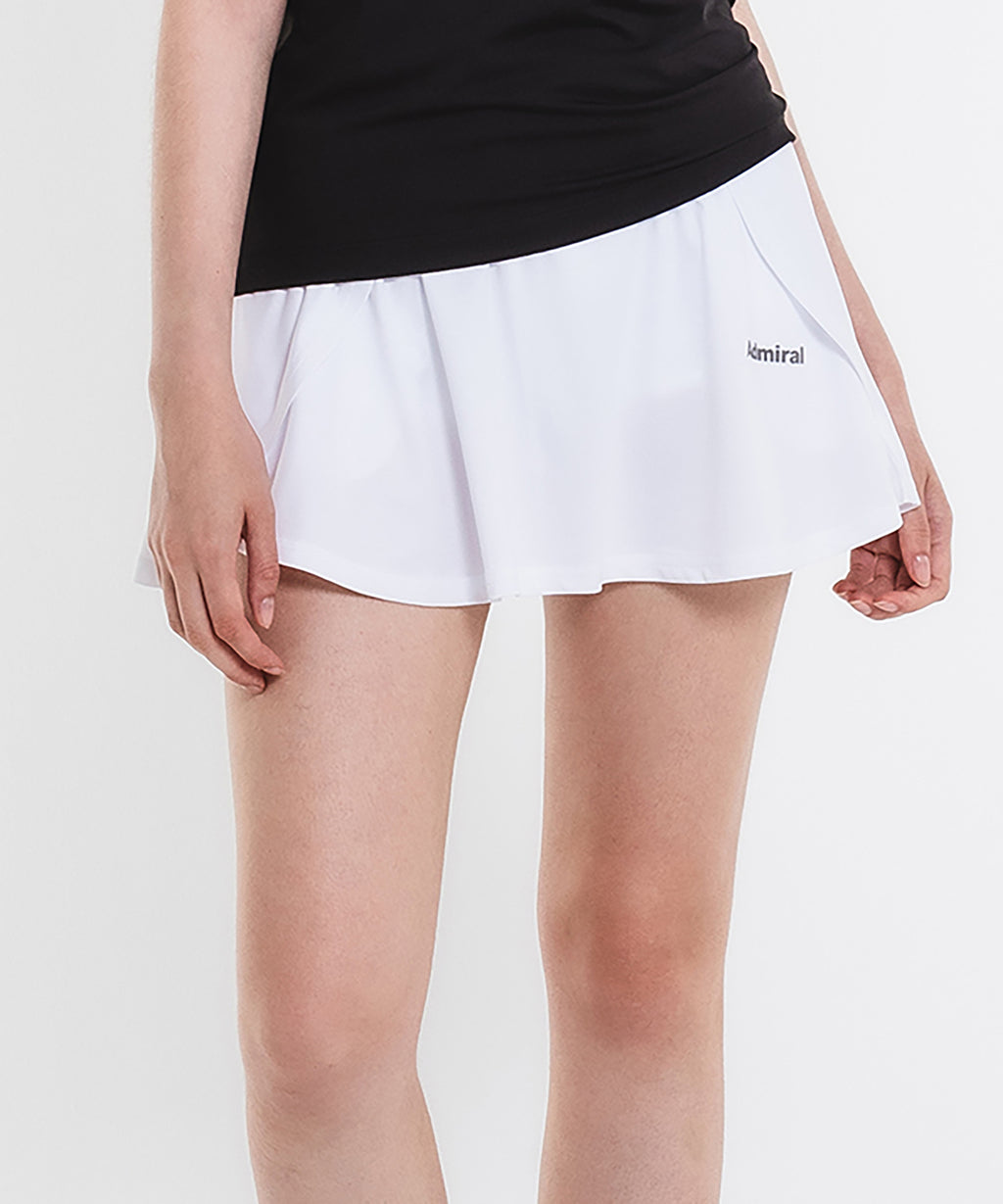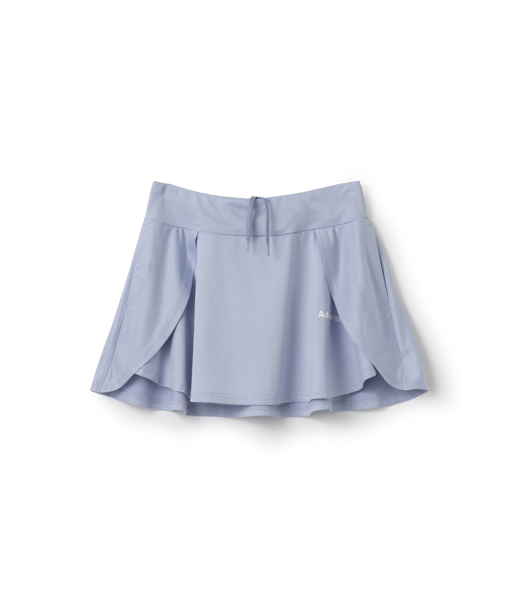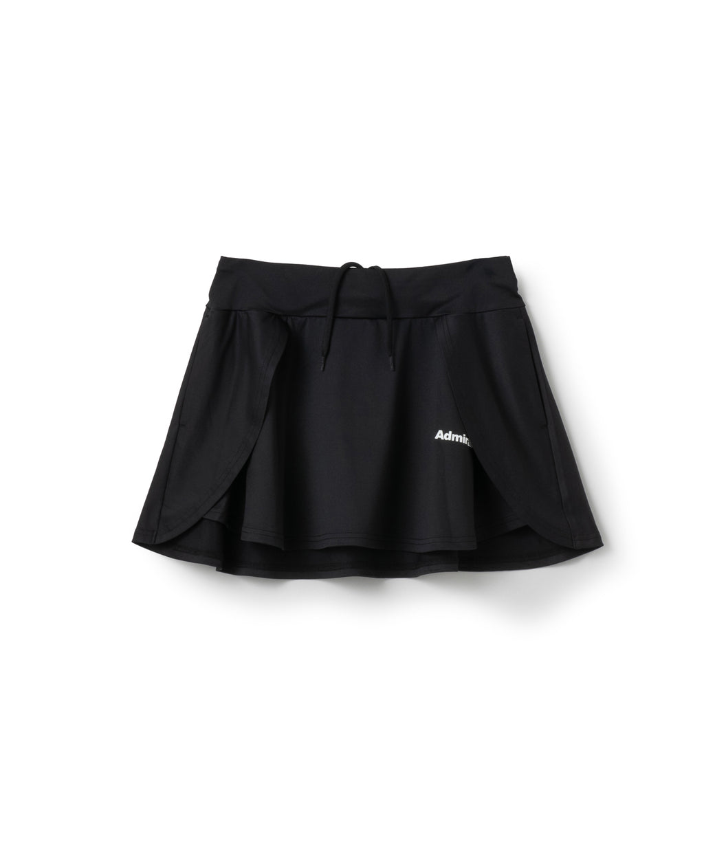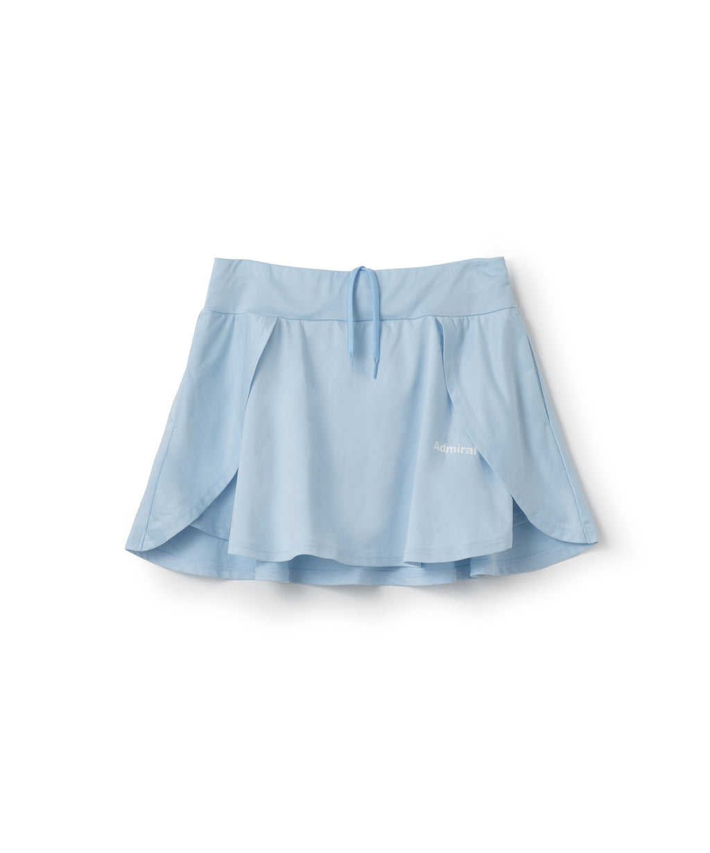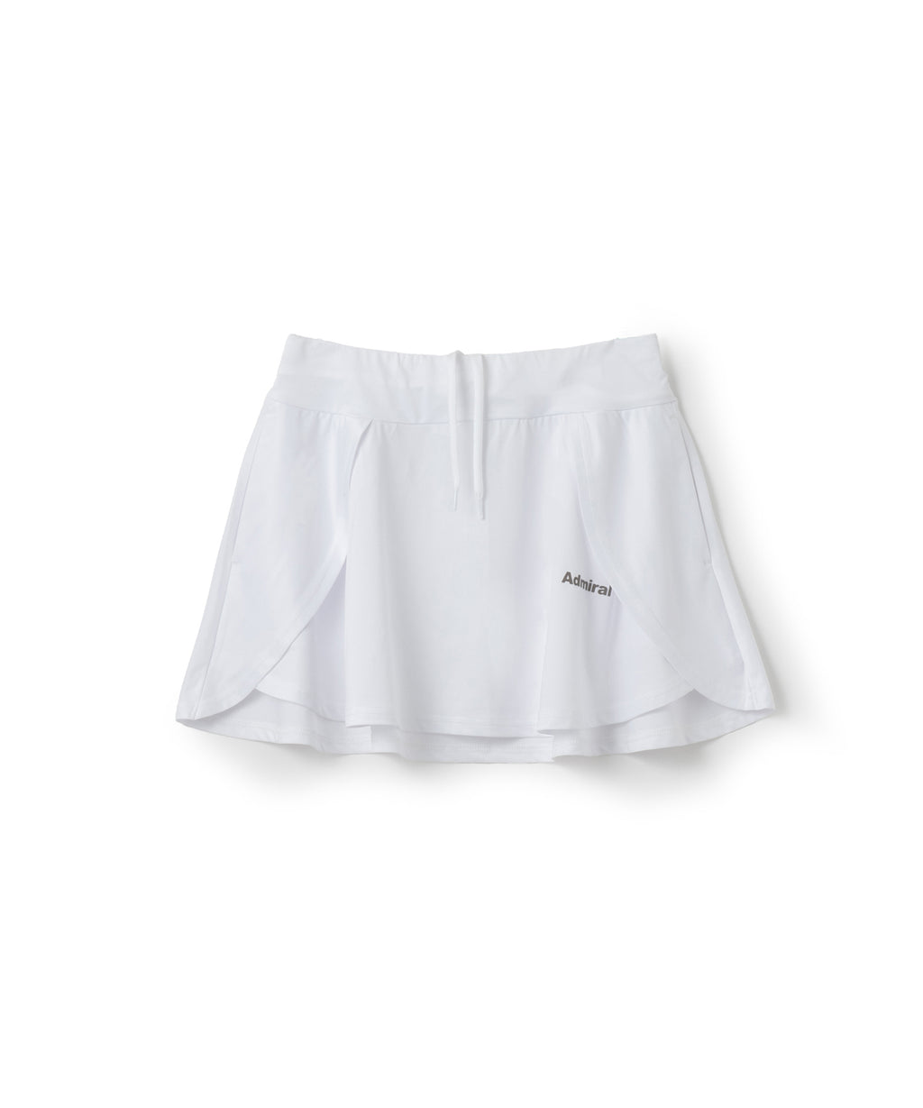 両脇でフラップ状に重なり、存在感のあるフレアシルエットのスコート。ソフトな風合いで上品な光沢のある細畝のカットソー素材。両脇ポケット、ウエスト紐調整有り。
