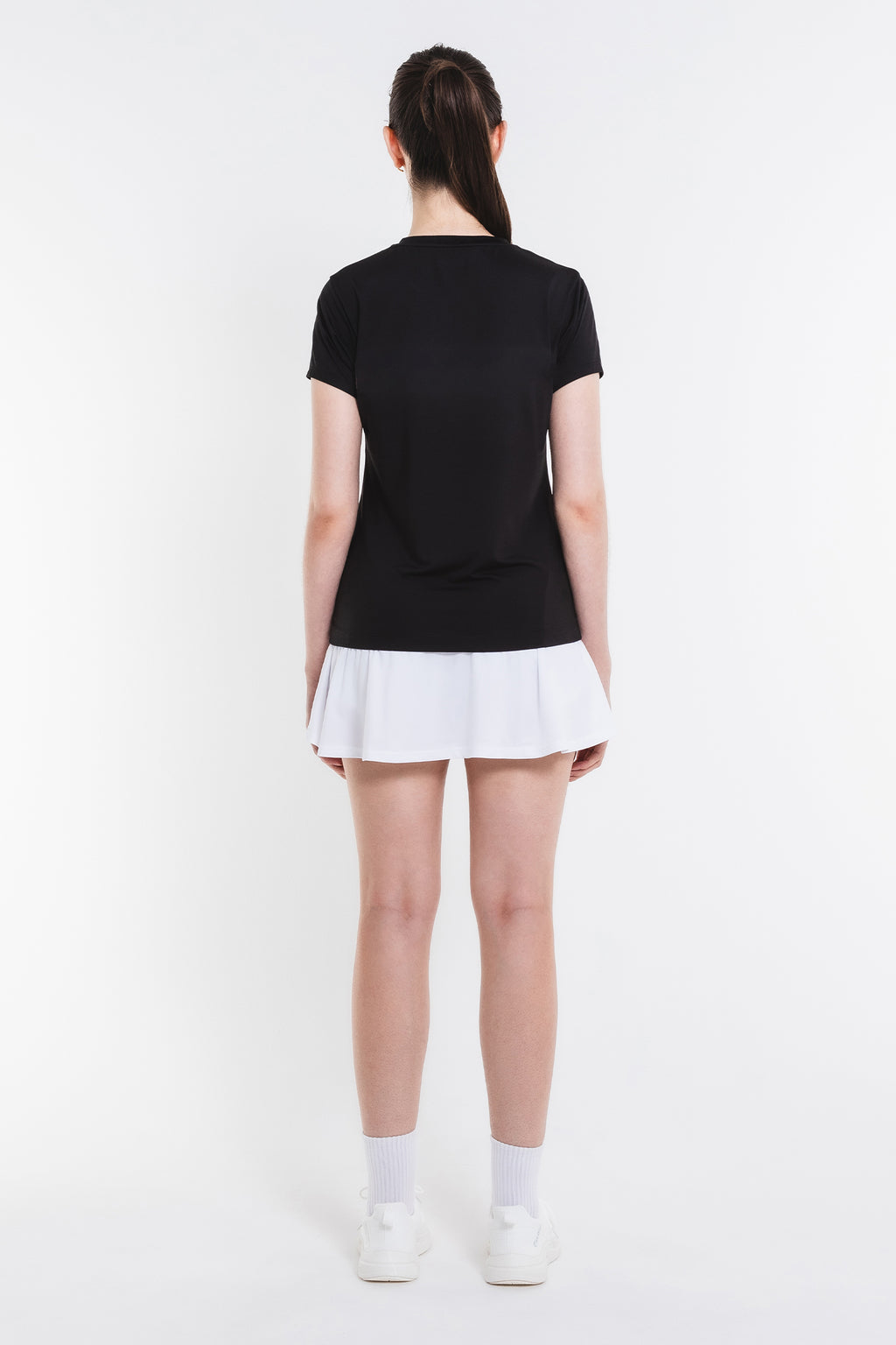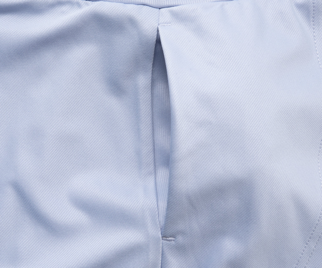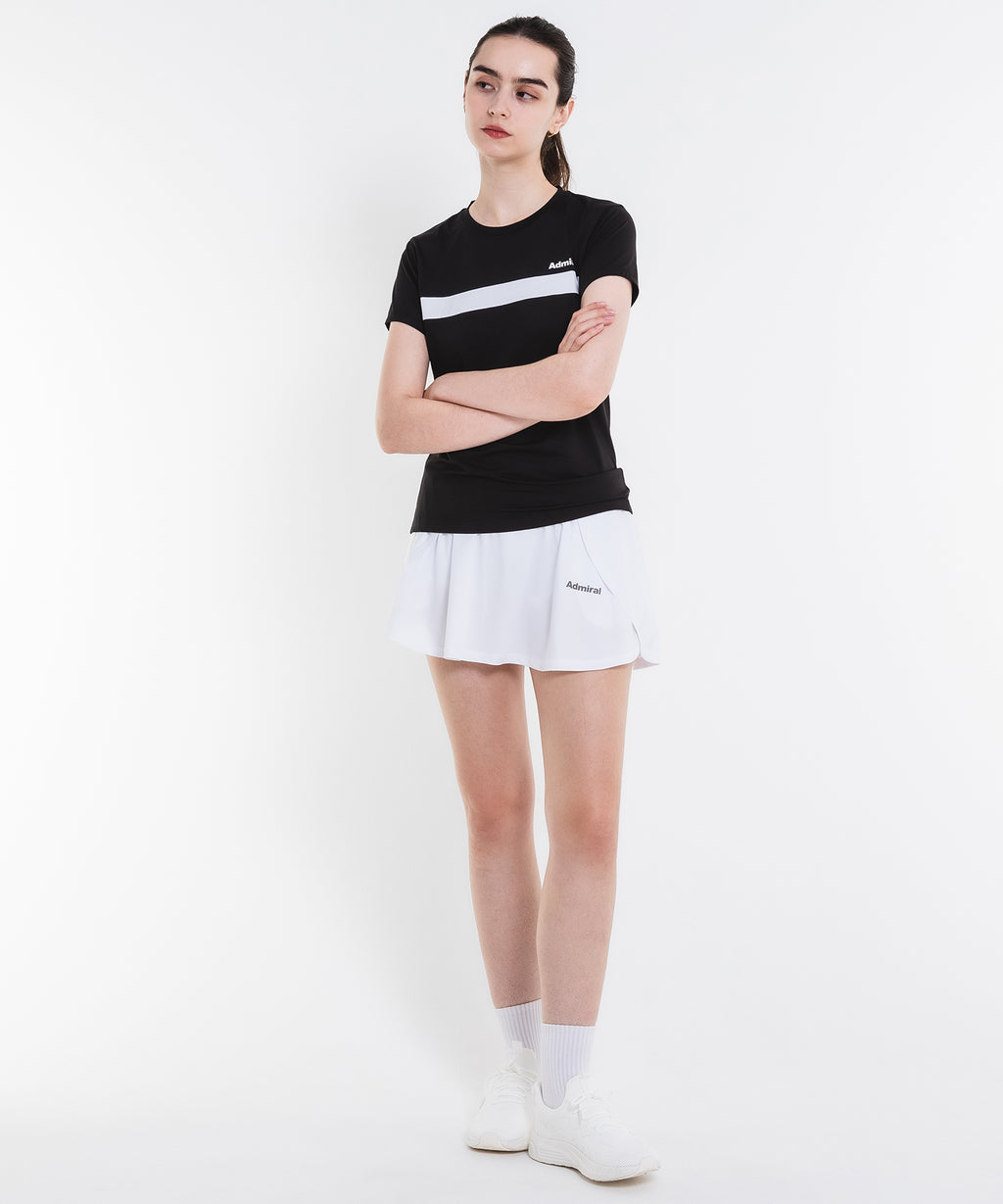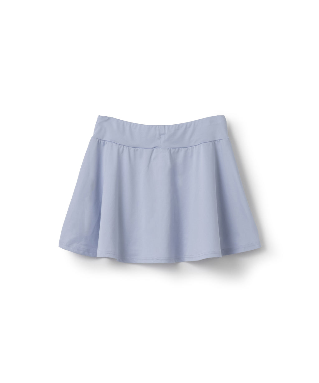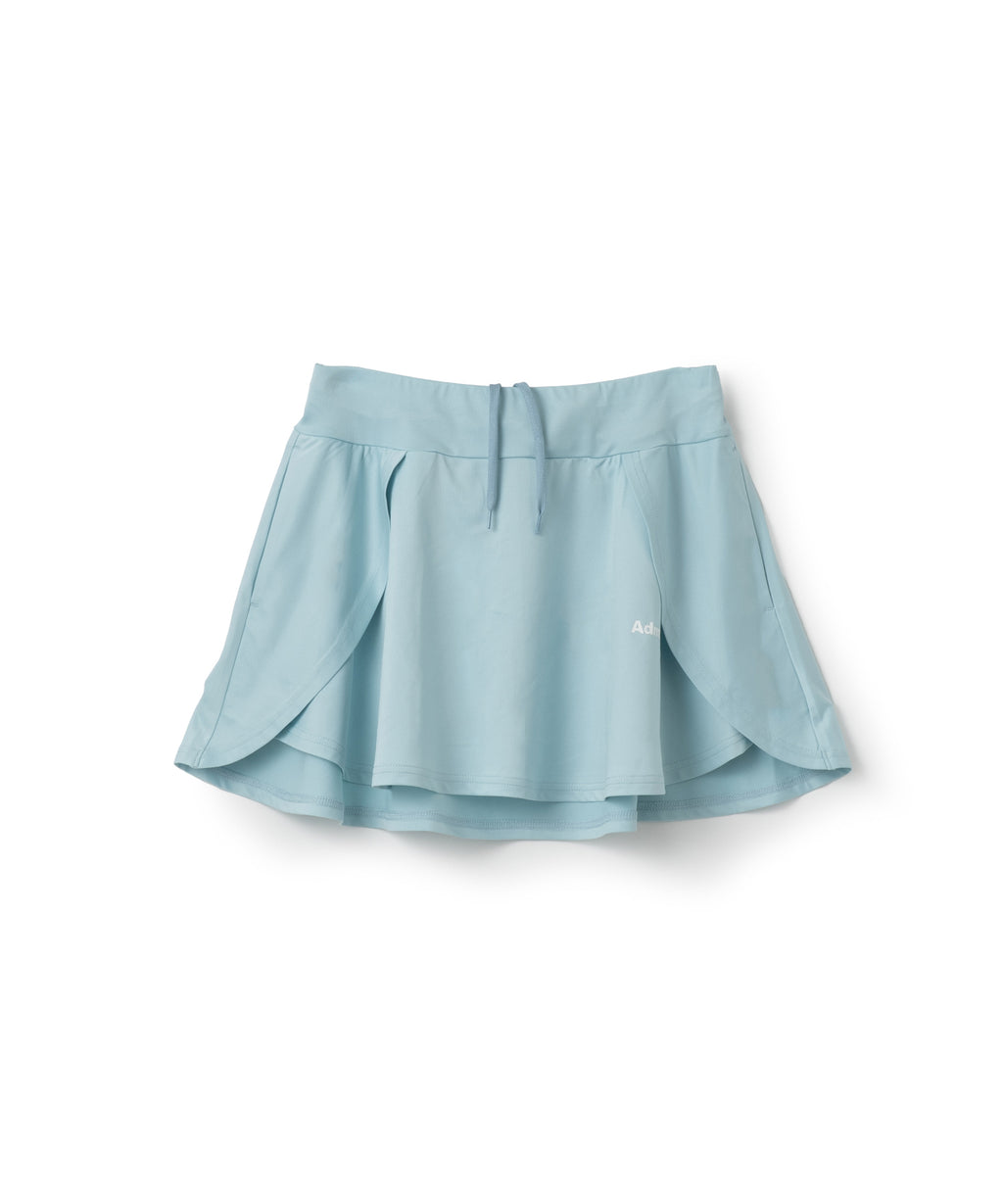 両脇でフラップ状に重なり、存在感のあるフレアシルエットのスコート。ソフトな風合いで上品な光沢のある細畝のカットソー素材。両脇ポケット、ウエスト紐調整有り。