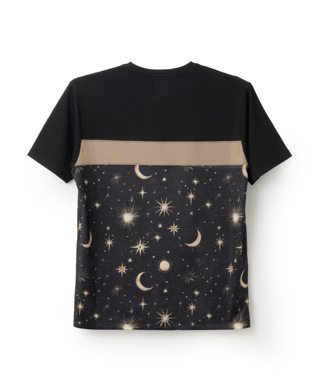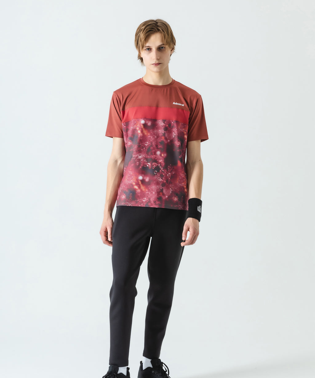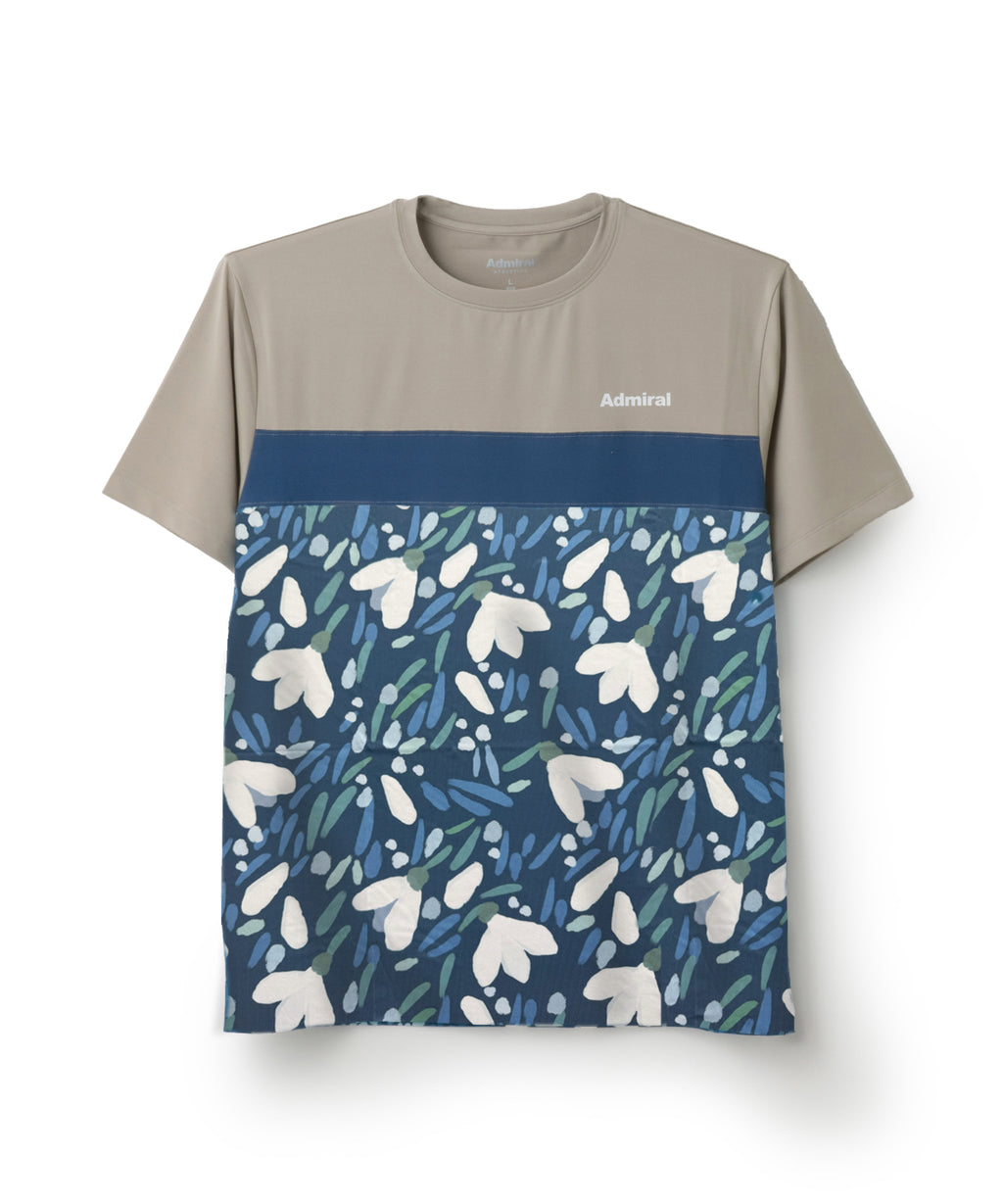 ・大胆な柄使いのアクセントに、顔周りに無地切替を施しメリハリを出した定番のライン切替Tシャツ。 ・吸水速乾とUVカットの機能を持ちながら、とろみのある抜群の伸縮性で しなやかな着心地を実現する定番のストレッチ天竺素材を使用。
