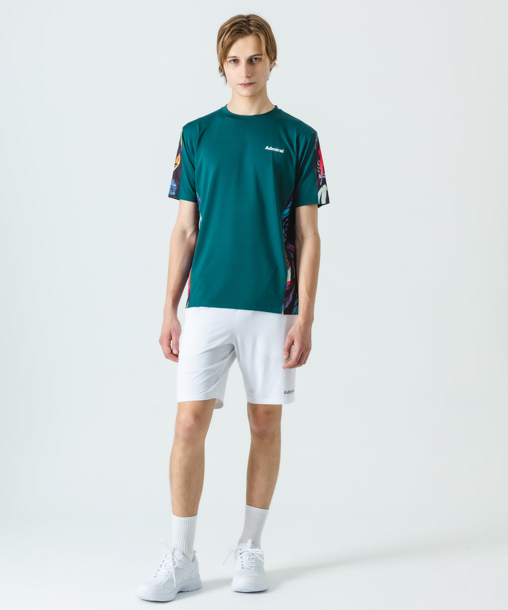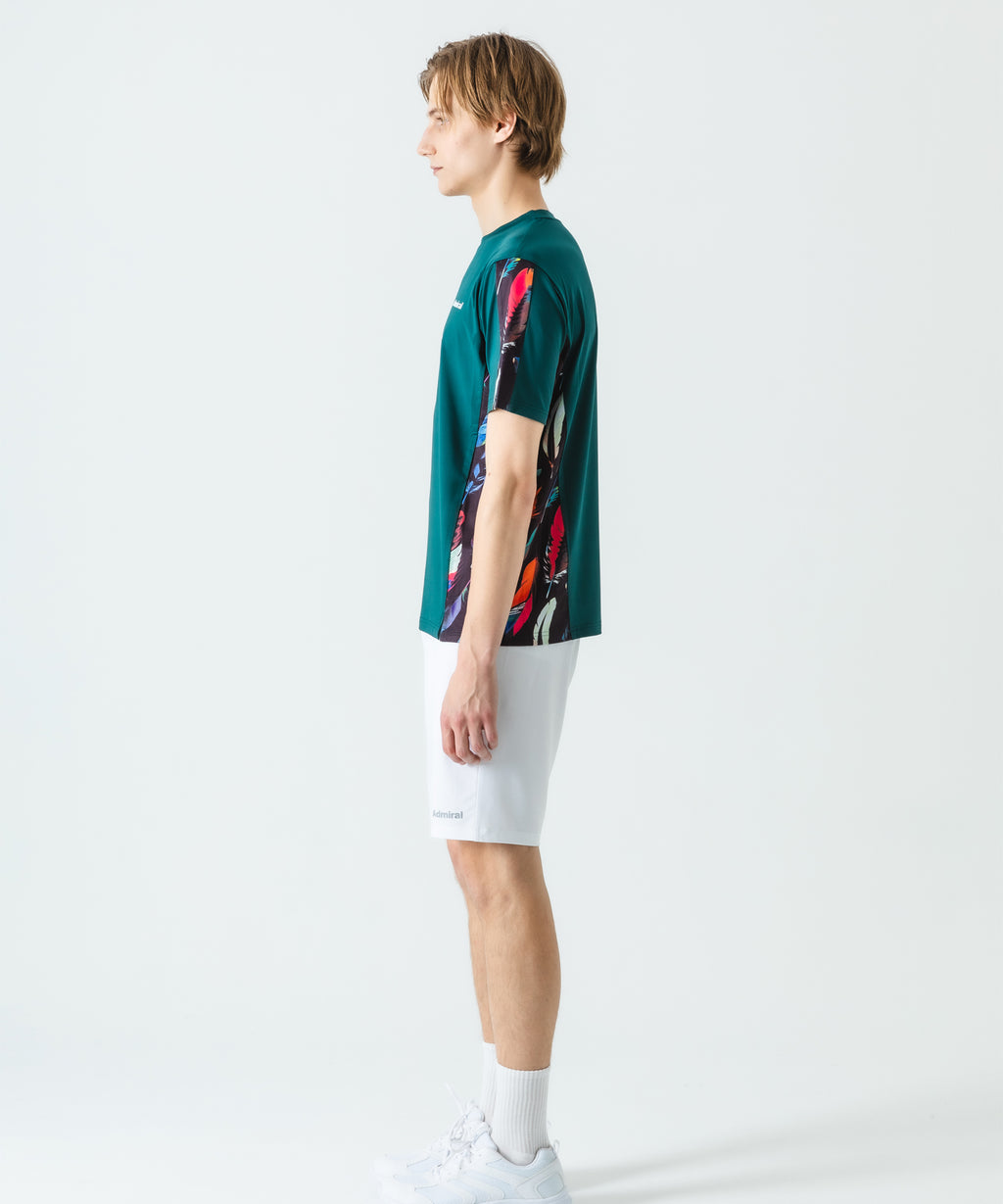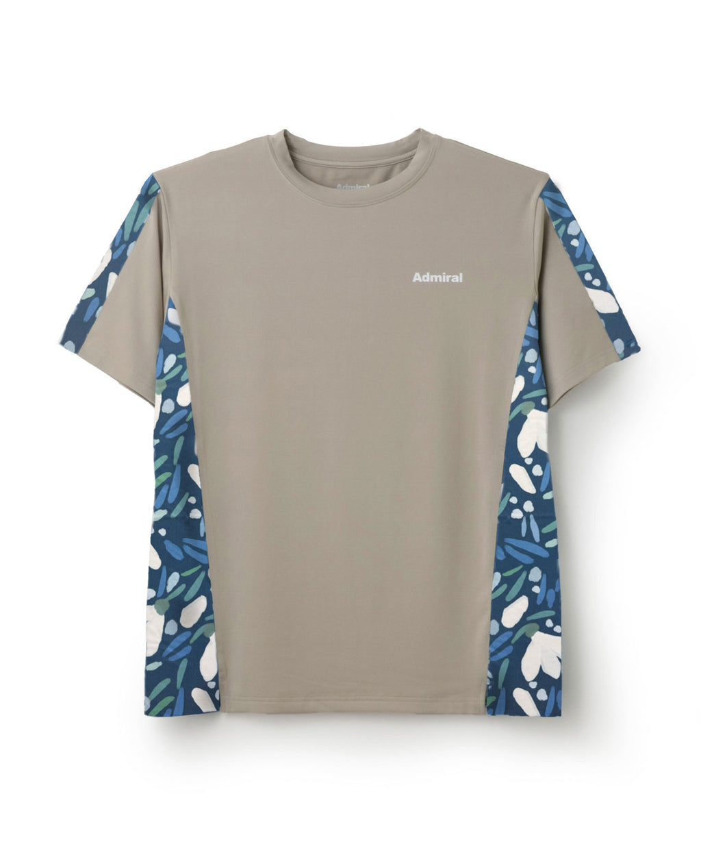 吸水速乾とUVカットの機能を持ちながら抜群の伸縮性でしなやかな着心地を実現する 定番のストレッチ天竺素材を使用。袖と裾のサイドラインの柄が映えるアクセントデザイン。