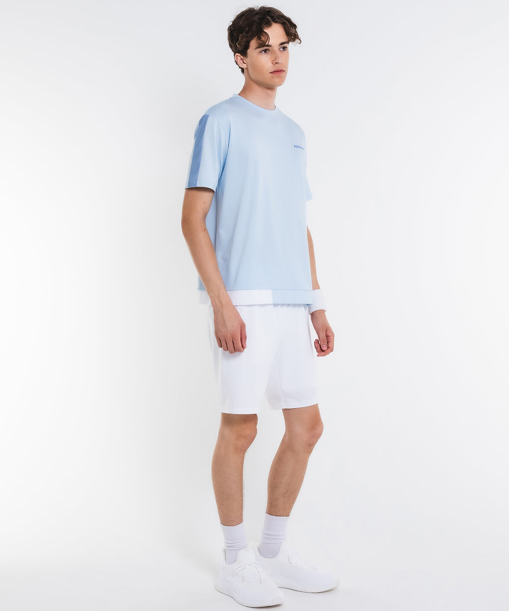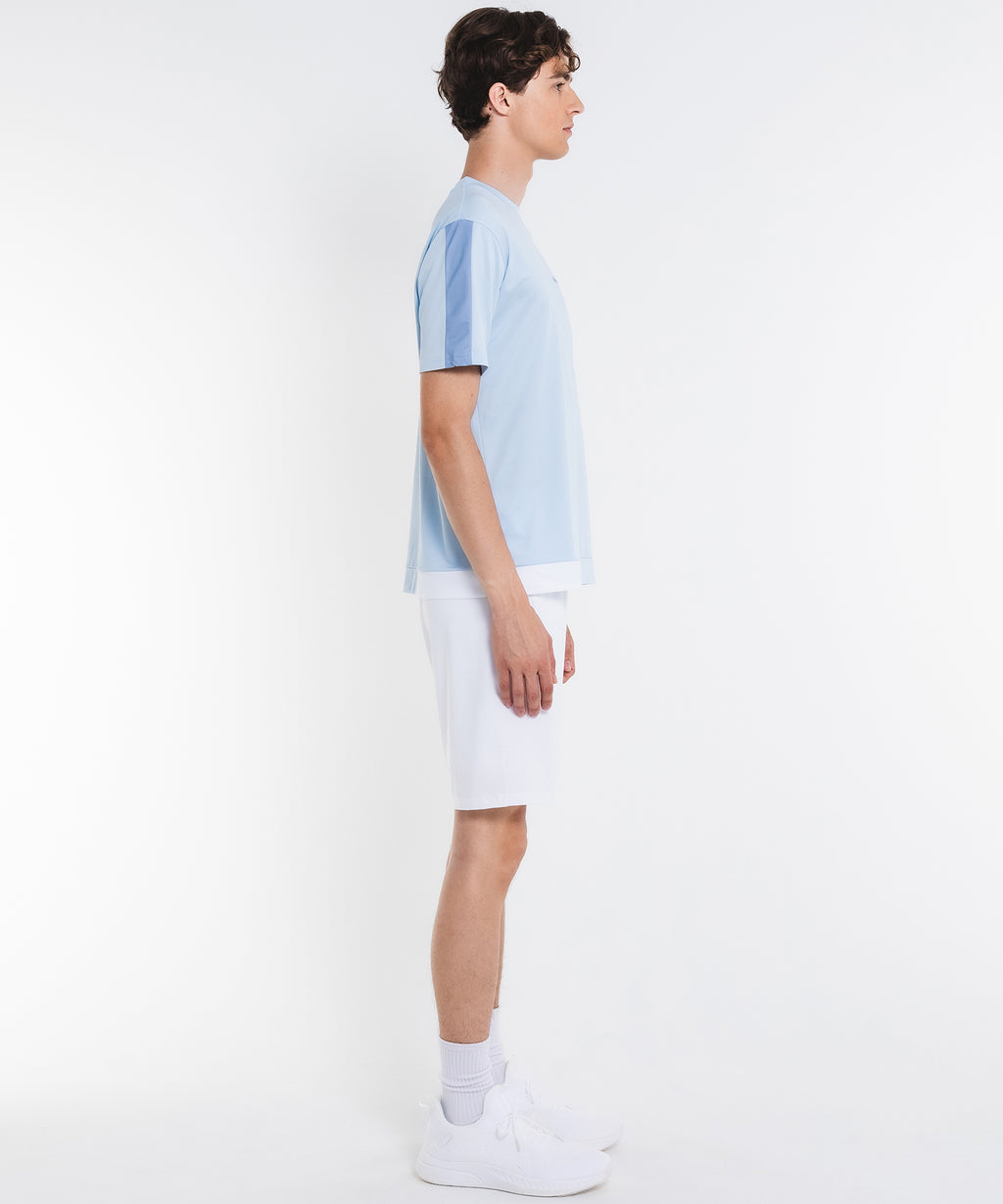 無地ベースにカラーを散りばめた遊び心のあるアシンメトリー切替デザインのTシャツ。