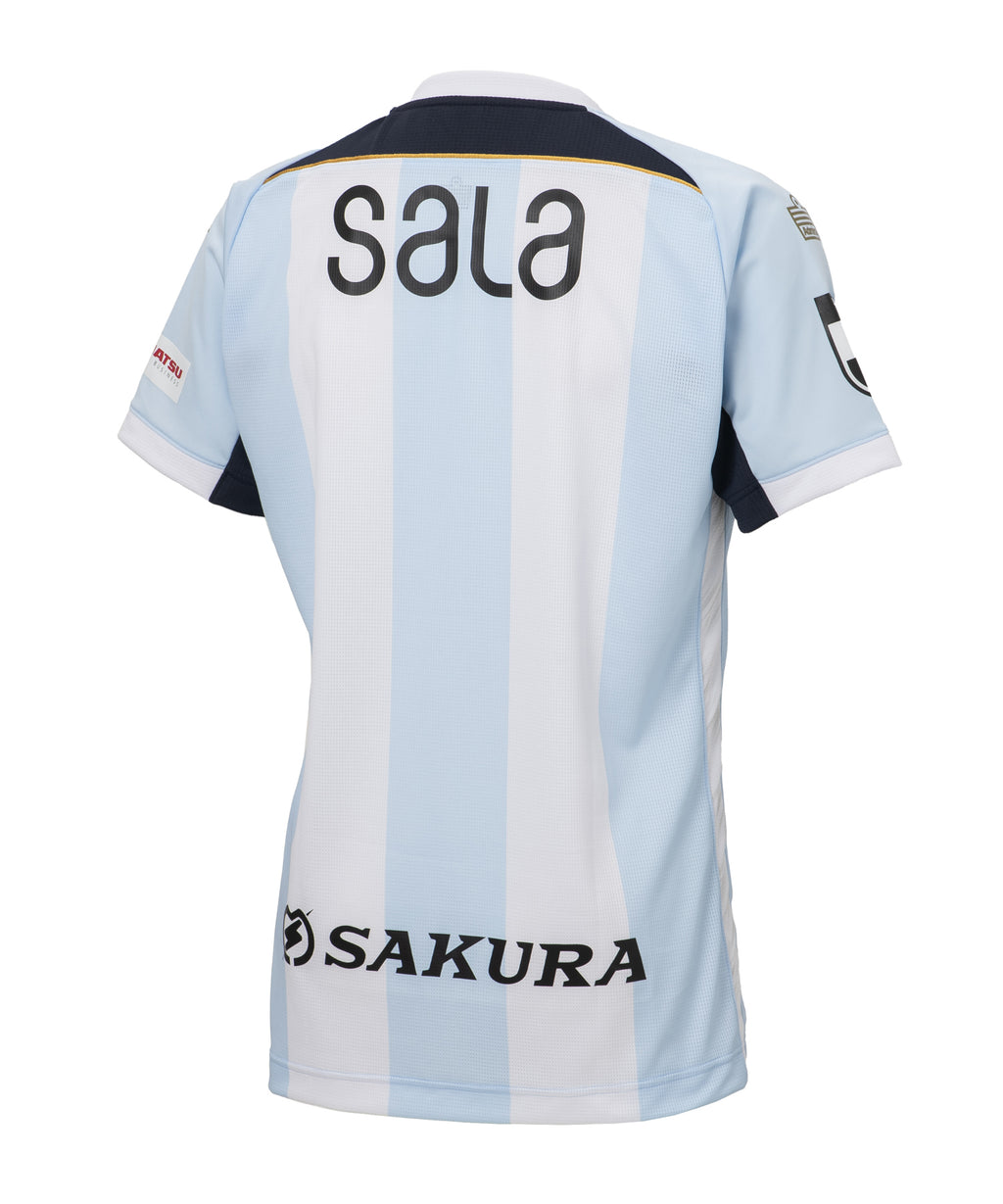 ホームタウンを力強く流れる天竜川のように、勝利と栄光を勝ち取り、頂点に向かって突き進む意志を、サックスブルーのストライプで表現しています。夏季も選手たちが最高のパフォーマンスを発揮出来るよう、ユニフォームシャツの生地には通気素材「エアホールニット」を採用しています。